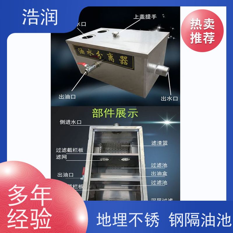 无论是餐饮行业、工业企业还是其他需要处理含油污水的场所,浩润不锈钢隔油池都是您的理想选择。它不仅能够有效解决油脂污染问题,还能为您的运营带来便利和经济效益。选择浩润不锈钢隔油池,就是选择可靠、高效、经济的环保解决方案。