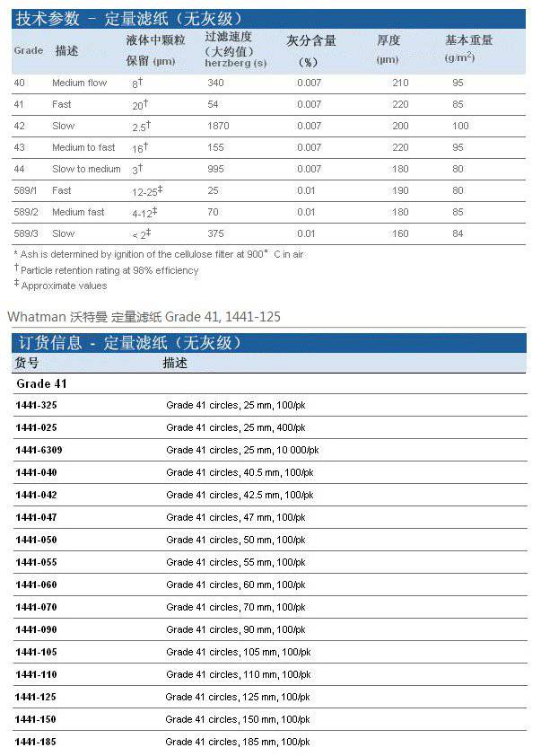 无灰级:Grade 40~44<0.007%,grade 589<0.01% - 非常纯的滤纸,是大部分主要分析过滤过程的理想用纸。