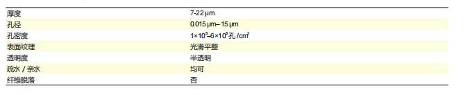 典型属性– Nuclepore聚碳酸脂膜