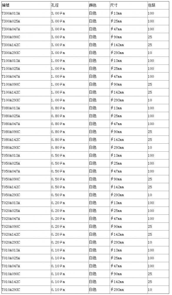ADVANTEC疏水性纯PTFE滤膜 特性:薄,多孔性,可用作性保留滤膜 惰性:对强溶剂,强酸和碱没有化学反应 使用温度范围: -120–260° 可高温高压消毒 用途 气体消毒:捕捉液体气雾 空气和气体通气:容许气体自由通过,同时阻止液体通过,可保护真空泵和重要样品