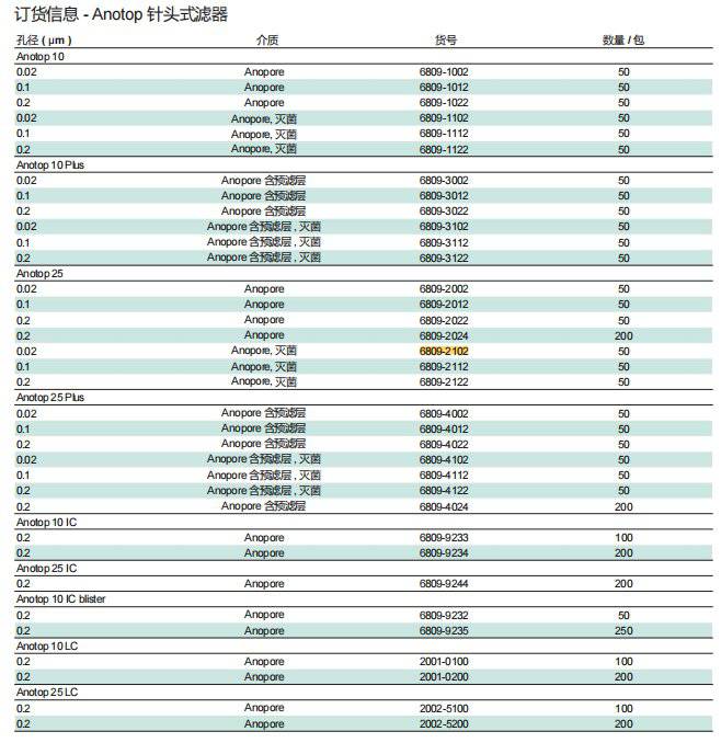 Anotop 10和Anotop 25 PlusAnotop Plus针头式滤器增加了一套***玻璃微纤维预滤层。这种滤器设计用来过滤难过滤的样品,对终滤层滤膜的过滤效率没有任何***影响,从而减少了澄清样品所需要花费的时间和费用。应用组织培养基的过滤难过滤样品的纯化胶体材料的过滤支原体的去除HPLC样品制备生物样品制备Anotop ICWhatman Anotop IC针头式滤器专们为用于后续离子色谱法和HPLC分析的样品制备而设计。这种滤器***了离子色谱测定中极低的阴离子浸出水平。特点及优点10 mm和25 mm直径针头式滤器每个批次都有离子色谱认证分析结果有更好的一致性延长了色谱柱的寿命经认证,***低水平的阴离子浸出,进而提高了结果的准确性应用离子色谱法样品制备HPLC样品制备Anotop LCWhatman Anotop LC针头式滤器专们为HPLC分析前的样品简单***制备而设计。这种滤器通过从分析样品中***去除颗粒而延长了色谱柱的使用寿命。由于Anotop LC针头式滤器由无色聚bing烯制成并使用了Anopore无机膜,可以确bao过滤产物的紫外吸收水平***小化。特点更优的分析结果一致性和***的色谱柱使用寿命极低的紫外吸收水平,可确保更优的HPLC结果易于与所有样品类型配套使用