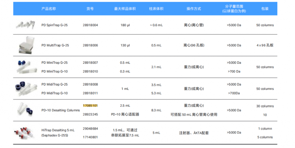 产品规格一次性 PD-10 脱盐层析柱,填充有 Sephadex G-25 层析填料,可处理 1.0–2.5 mL 的样品量