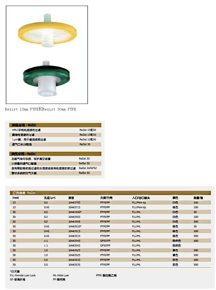WHATMAN ReZist针头式滤器30mm无菌PTFE材质0.45um 10463513 技术参数: