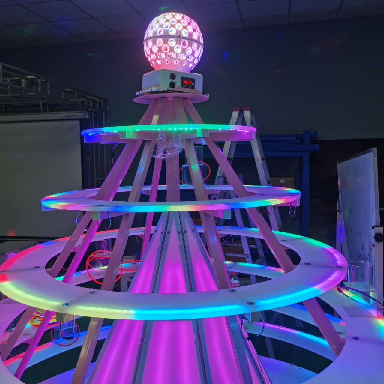 占地面积20个平方。6层灯塔设计每层灯光有几十种变换效果。机器自带音乐,支持蓝牙连接。