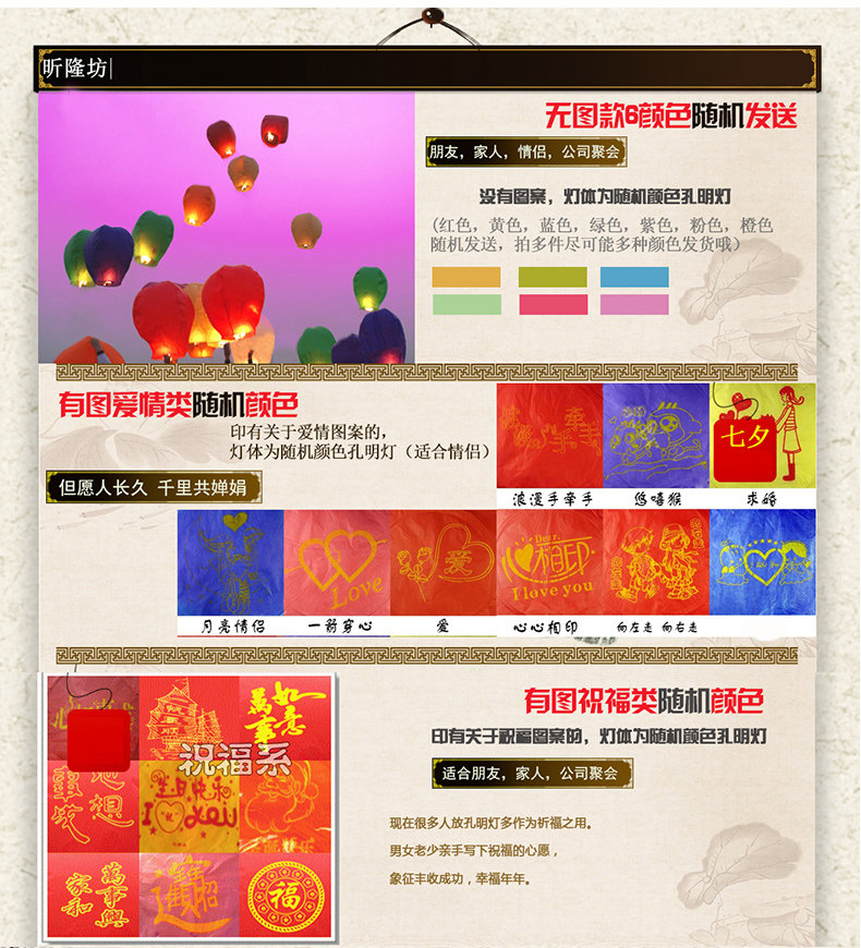 ③儿童必须在成年人的监护下使用。【有图混色孔明灯】指有随机图案随机颜色孔明灯