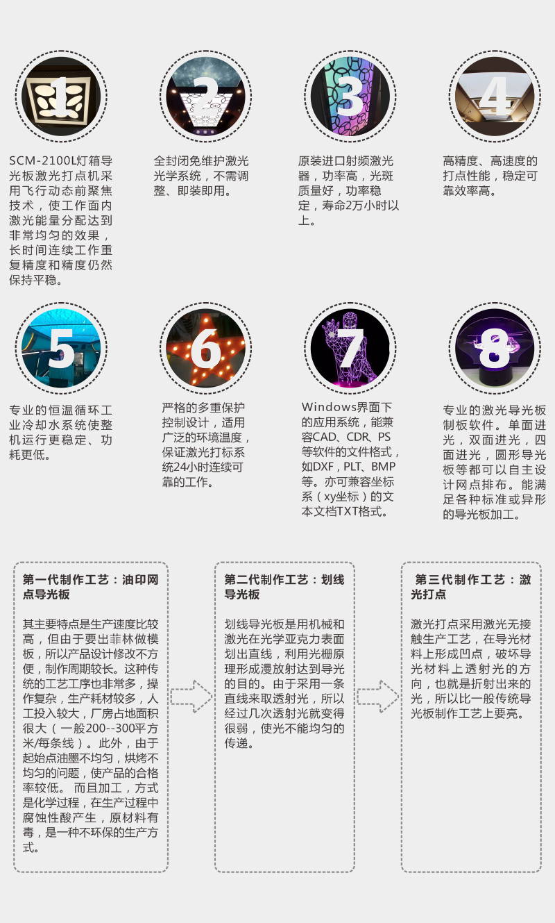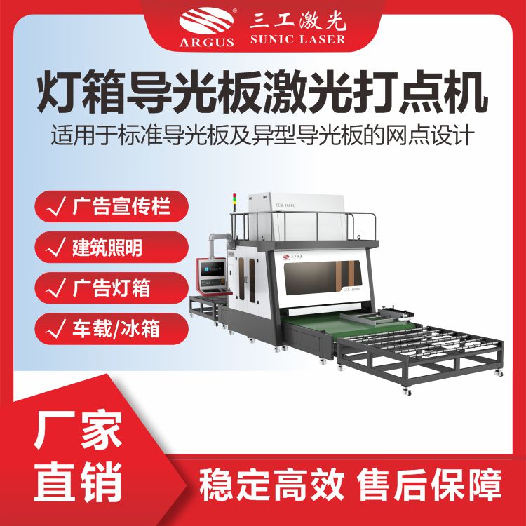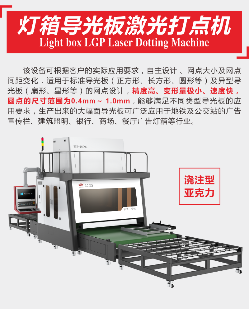 该设备可根据客户的实际应用要求,自主设计、网点大小及网点间距变化,适用于标准导光板(正方形、长方形、圆形等)及异型导光板(扇形、星形等)的网点设计,精度高、变形量极小、速度快,圆点的尺寸范围为0.4mm~ 1.0mm,能够满足不同类型导光板的应用要求,生产出来的大幅面导光板可广泛应用于地铁及公交站的广告宣传栏、建筑照明、银行、商场、餐厅广告灯箱等行业。