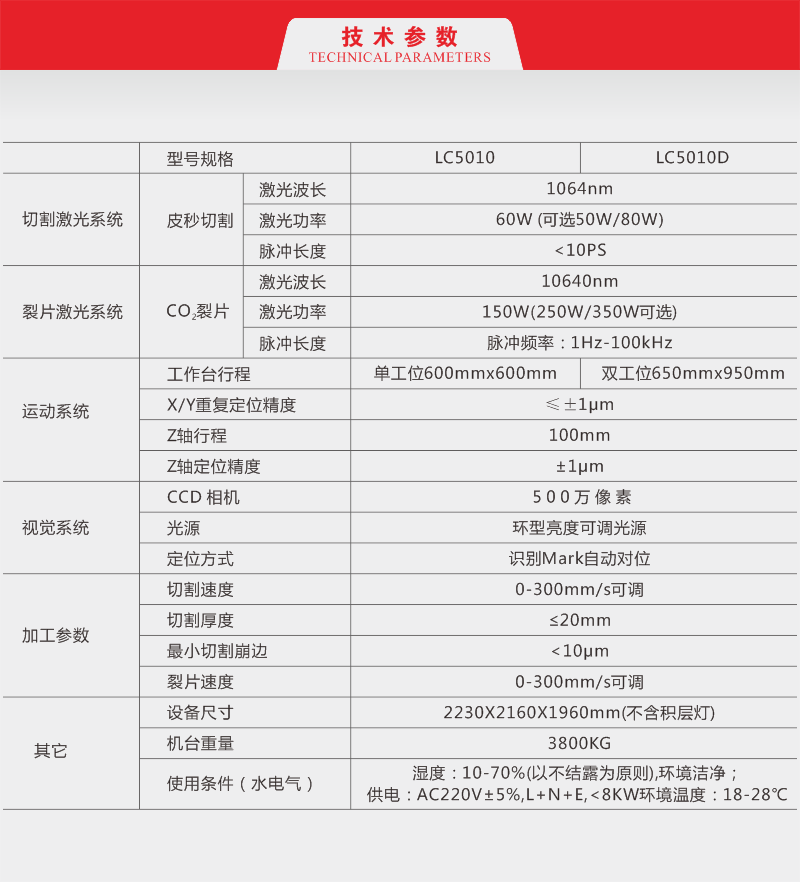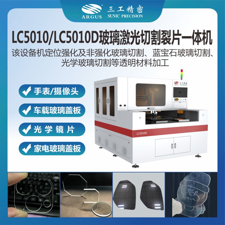 LC5010/LC5010D型玻璃激光切割裂片一体机定位强化及非强化玻璃切割、蓝宝石玻璃切割、光学玻璃切割等透明材料加工,整机具有以下特点: