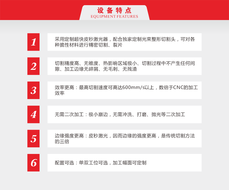 切割精度高、无锥度、热影响区域极小、切割过程中不产生任何间隙、加工边缘无碎屑、无毛刺、无残渣。