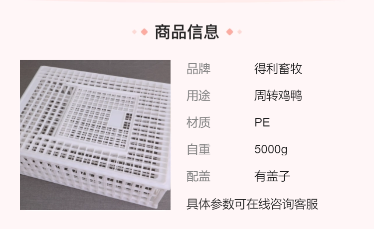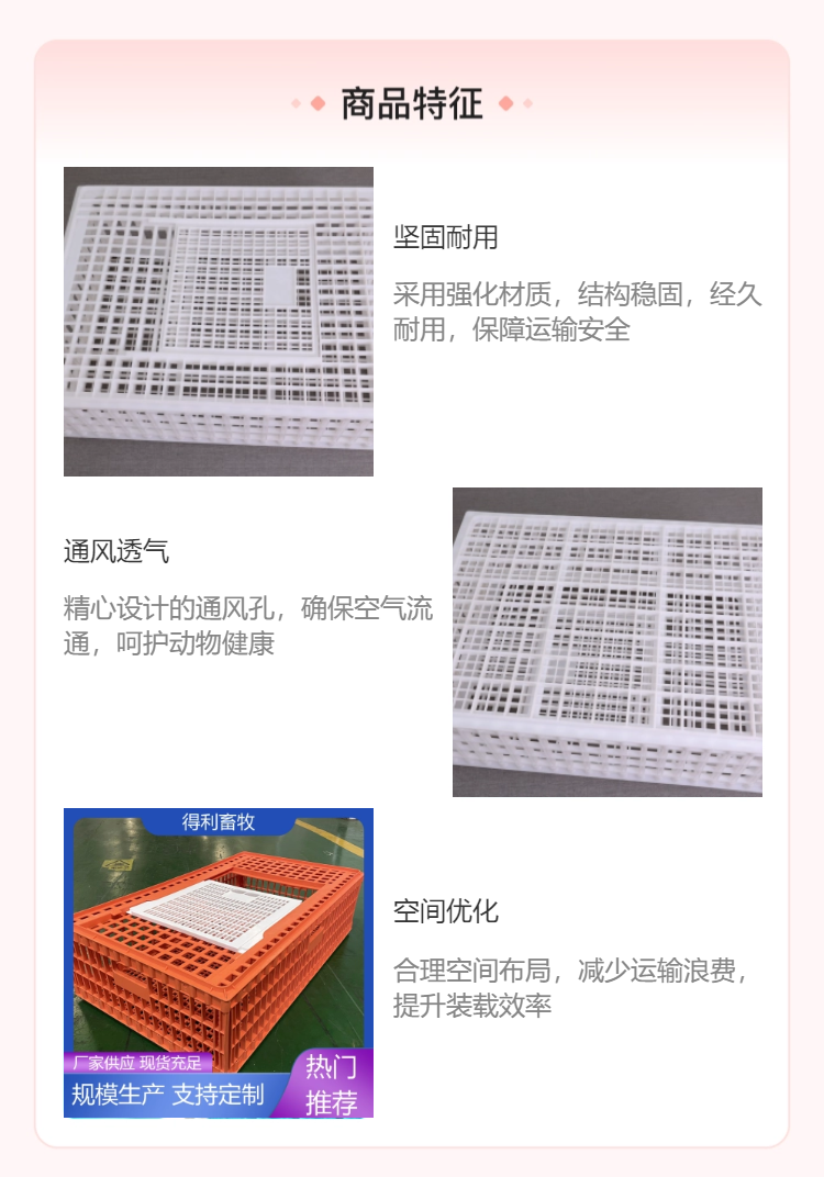 产品分四种尺寸。塑料笼子质轻、美观、易清洗消毒、通风透气性好。纯原料生产制造,比同类产品更耐磨、耐腐蚀、更耐用、加强加厚型的底和面设计、抗摔抗压的能力特别强。鸡笼门开关方便,容易更换;笼底细小的网格结构能有效避免活鸡夹伤、造成表皮瘀血。可满足高强度的频繁周转