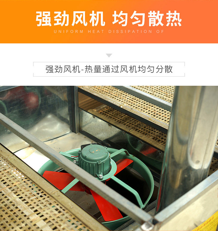 本款烘烤箱电机已安装风机,筛子分竹筛与铁筛,竹筛20元一块,铁筛35元一块。可根据需要自由选配。