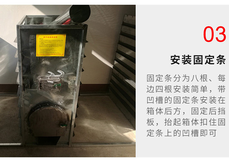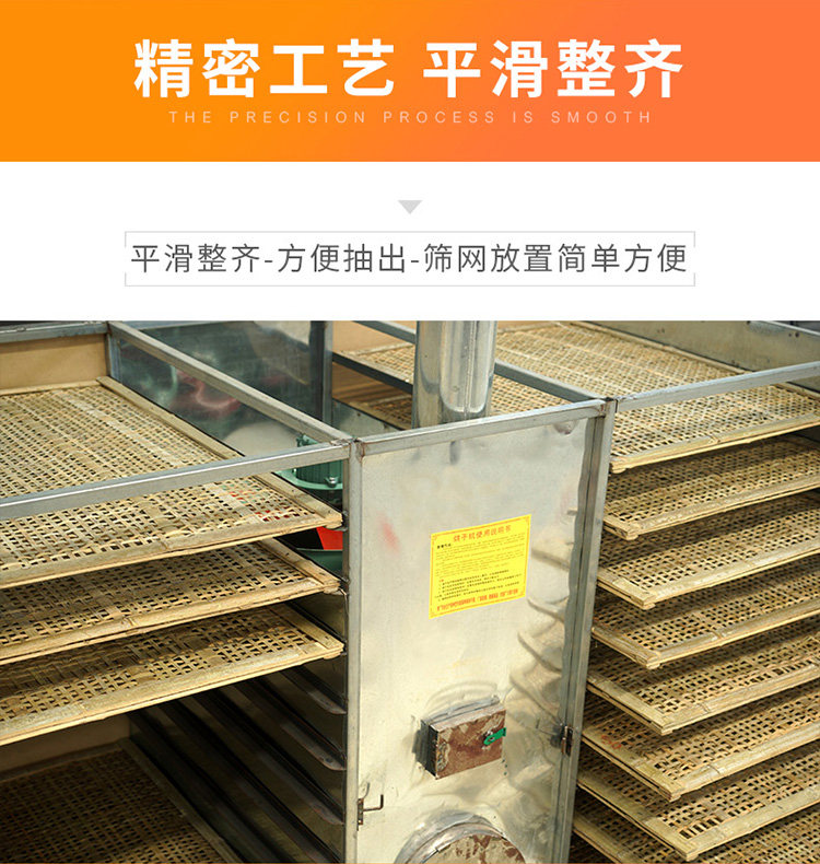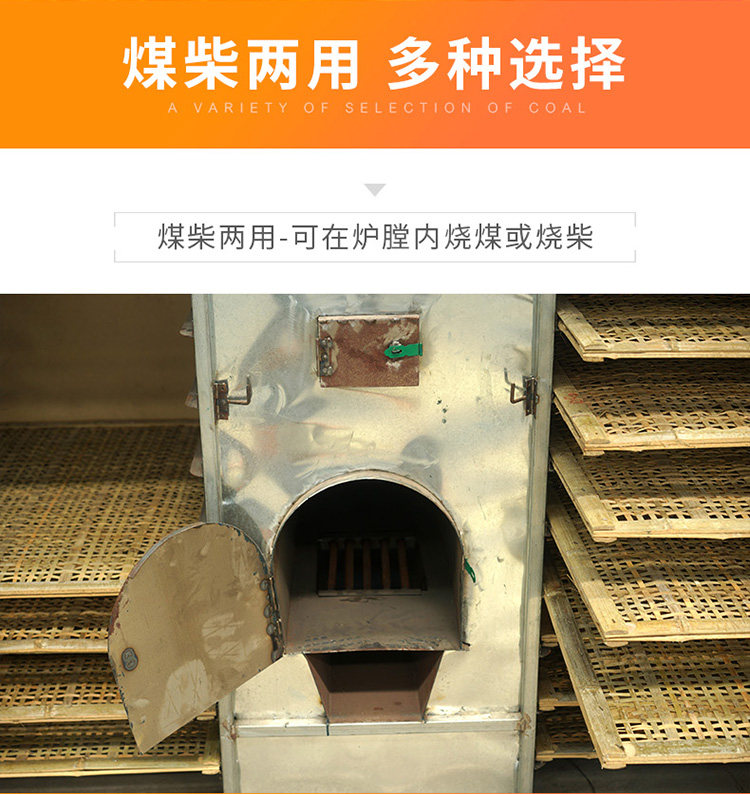3、使用时正确操作方法:将承载物用的筛子均匀地放上待烘干的物料后,按顺序依次装入箱体内,关好箱门,开启风机,然后将烟煤或柴禾放入炉膛中点燃进行加热,开始火力不宜过大,应慢火加温,烘制过程中,开始3小明内温度一般控制在25-35度为宜。随着烘烤物水分的蒸发,烘箱底部的烘烤物会比上面的烘烤物要干的快,这个时候进行上下烘烤盘的调换,可促使更好的烘烤物品,并且节省烘烤时间。