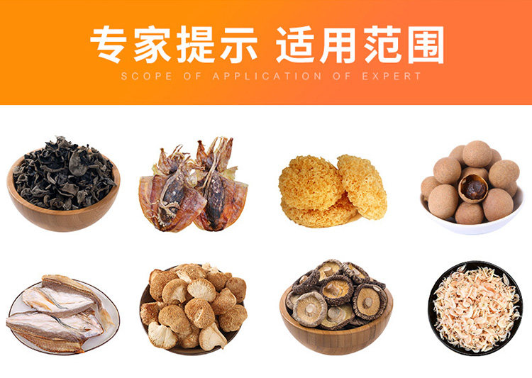 适用范围:香菇、蘑菇、木耳、银耳、羊肚菌等食用菌类、辣椒、豆角、红薯干、笋干、竹荪、干菜类、柠檬、核桃,菊花、金银花、枸杞、莲子、红枣、中草药材,鱼、虾、蛇、海鲜、农产品类等范围广范