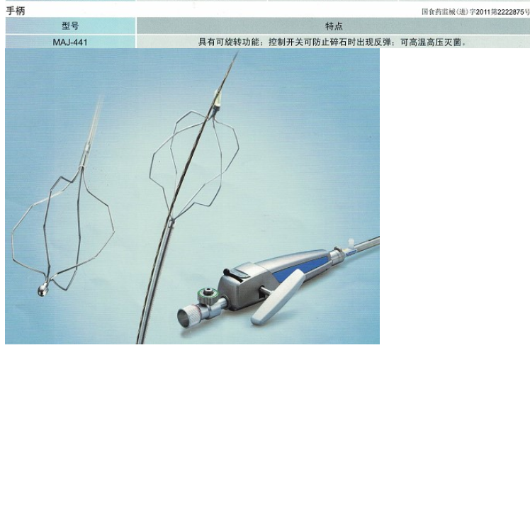 该产品由一次性碎石器和BML手柄组成,其中一次性碎石器分为推拉式和导丝式。碎石器为包装