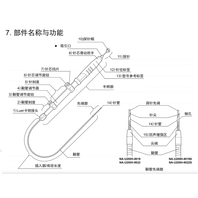 本产品由一次性内窥镜超声吸引活检针(NA-U200H-8019S、NA-U200H-8019.、NA-U200H-8022S、NA-U200H-8022)和Medallion吸引活检针筒组成。活检针的插入部探针的材料为镍钛合金。灭菌,一次性使用。货架有效期3年。