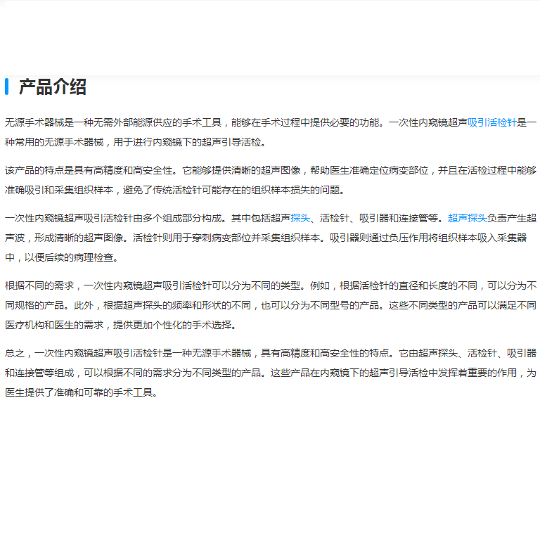 本产品与奥林巴斯的超声内窥镜组合使用,在超声引导下吸引采集体腔内的组织或细胞。