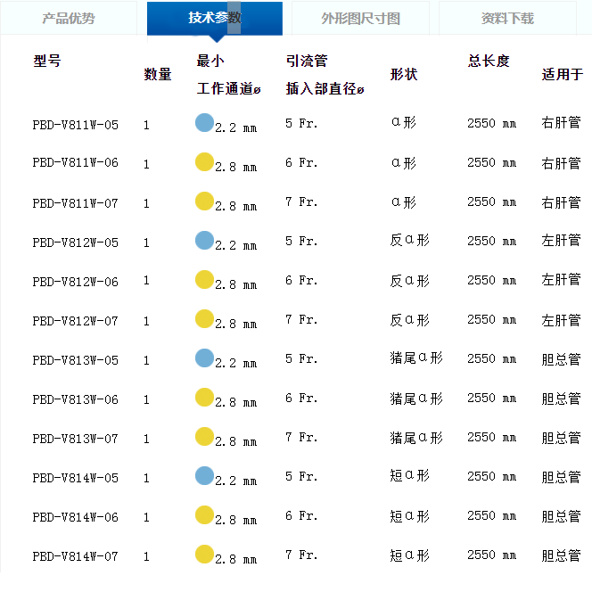 产品规格:本产品为一次性使用产品,小工作通道2.2 mm,引流管插入部外径5 Fr.,形状α形,