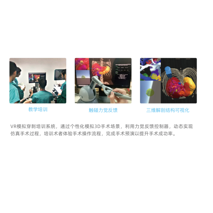 产品描述:VR模拟穿刺培训系统,通过个性化模拟3D手术场景,利用力觉反馈控制器,动态实现