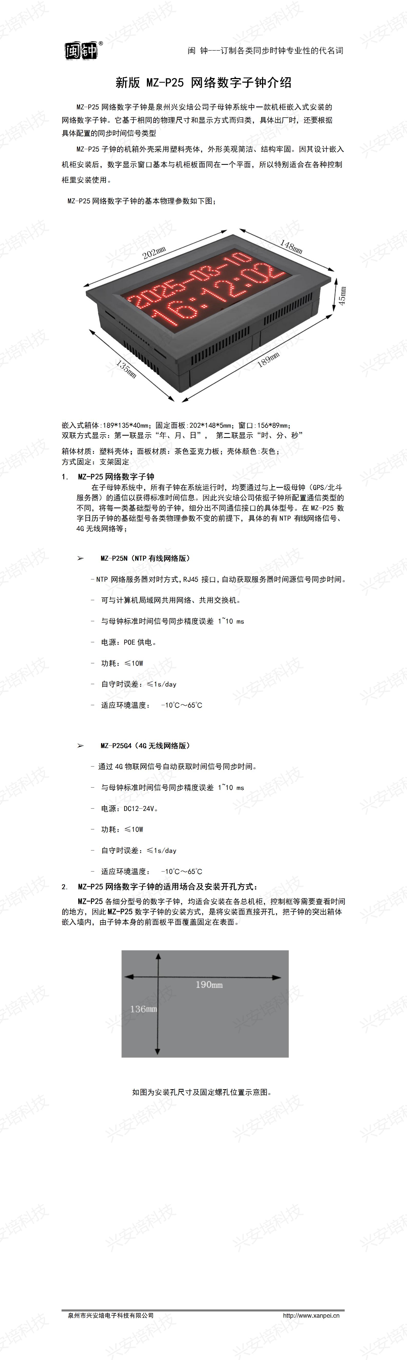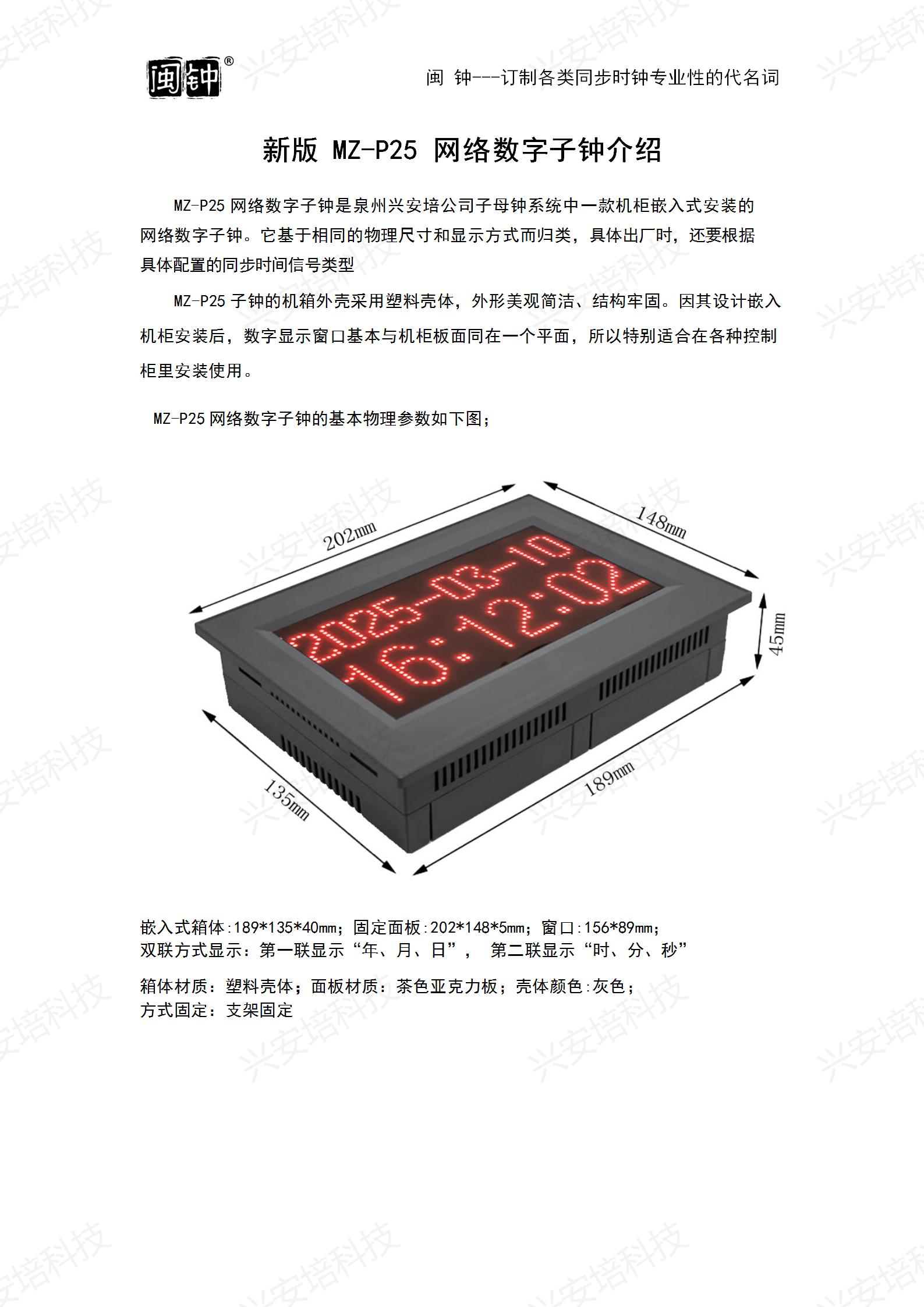 MZ-P25网络数字子钟是泉州兴安培公司子母钟系统中一款机柜嵌入式安装的网络数字子钟。它基于相同的物理尺寸和显示方式而归类,具体出厂时,还要根据具体配置的同步时间信号类型