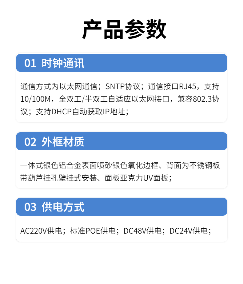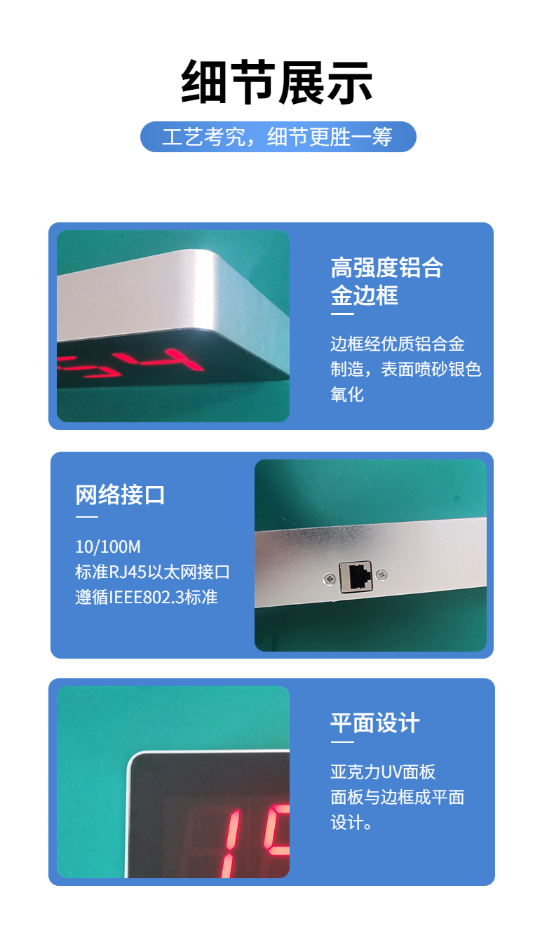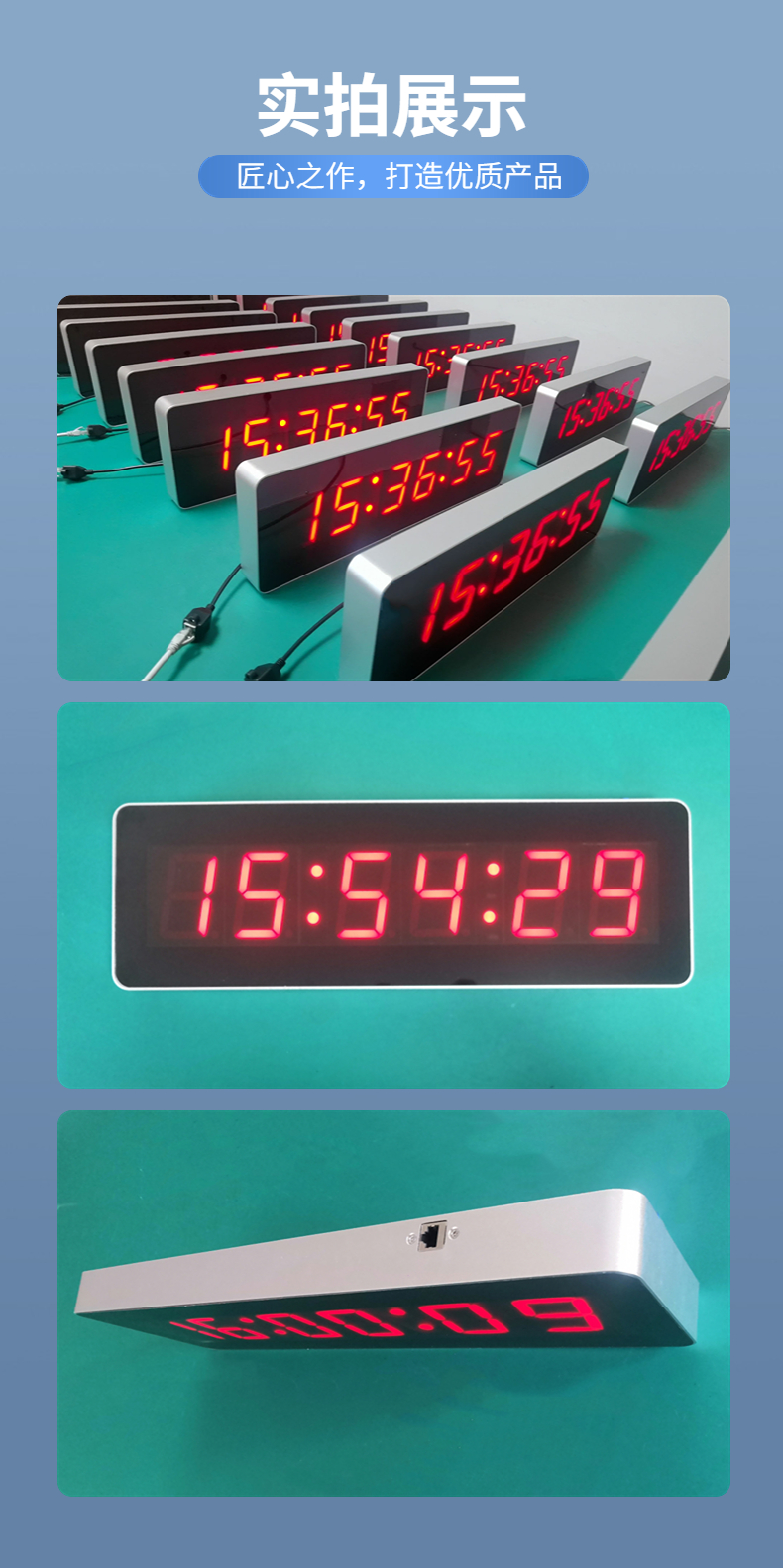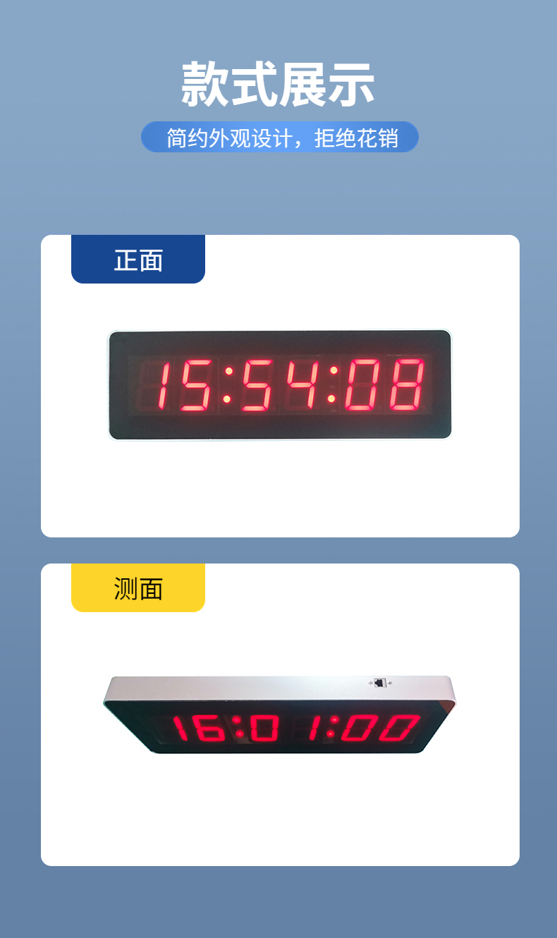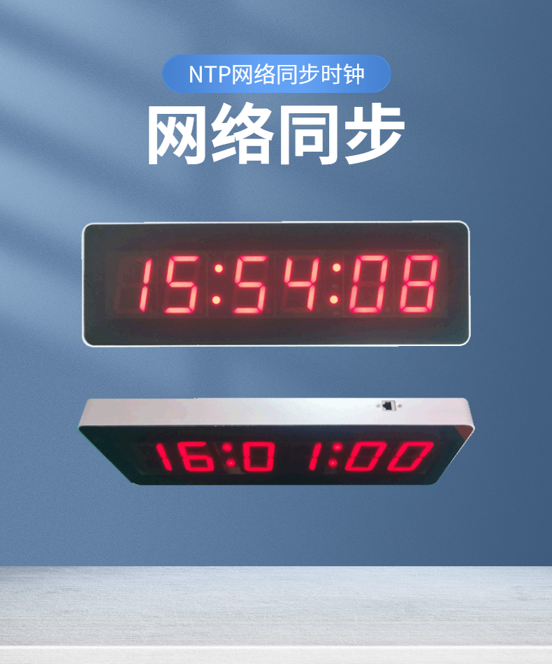 3、同步授时的电子钟,可获取公共网时间服务器时间或局域网内授时服务器时间,同步于电子钟走时和更新内部RTC电路,在守时状况下,误差每天0.5秒。