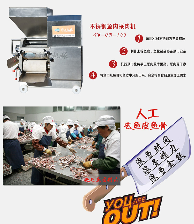 江西赣云食品机械有限公司生产各类肉制品加工设备,其中像本款鱼肉采肉机设备,畅销于全国各大鱼糜制品大省,如福建、广东、湖北、海南、浙江、江苏等地。鱼刺分离机也称鱼肉去刺机,主要是通过采肉带和采肉滚筒挤压原理将鱼肉从滚筒小孔内挤出,实现鱼肉和鱼骨、鱼皮的分离,鱼刺分离机把鱼皮、鱼骨、鱼刺留在采肉桶外,由刮刀把它送出鱼浆过滤精滤机外,鱼肉留置内部,操作简单方便,可大大提供效率,是人工无法达到的效果。该机除了可以采鱼肉,还可以采虾肉、蟹肉泥鳅肉等水产品,用于去骨分离。 鱼刺分离机设计合理,精悍创新,作业过程升温低、效益高。接触食品部位及外观部分均采用不锈钢材料,符合国家食品卫生标准要求。开采的鱼肉可以直接用于生产各种鱼糜制品:鱼丸、鱼面、鱼胶、鱼饺子等产品,像人们非常喜爱吃的福州鱼丸,设备就包括这么一台鱼肉采肉机,大大地提高了鱼的经济价值和利用率。 售后服务:所有鱼刺分离机一律享有终身维修,电机保修一年和终身售后技术支持!