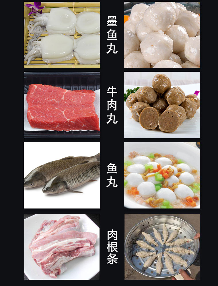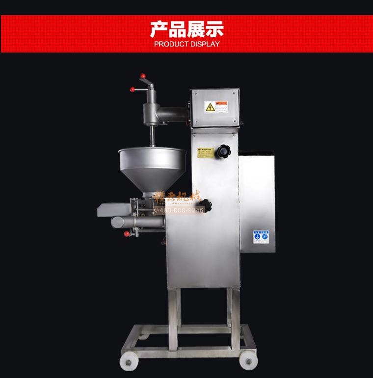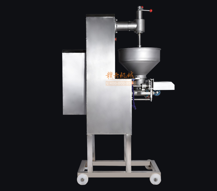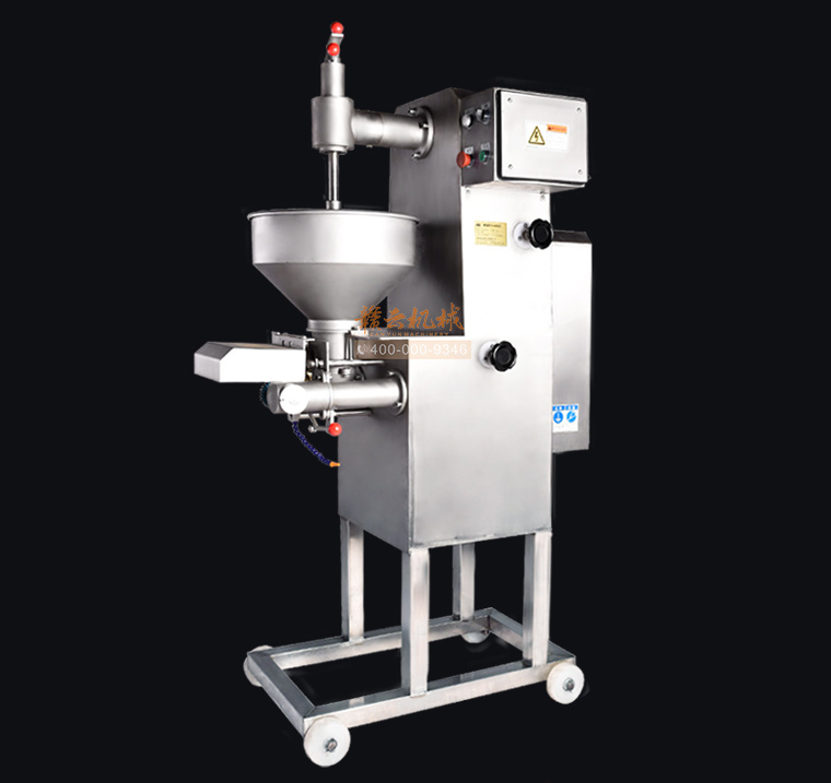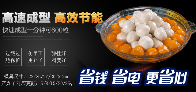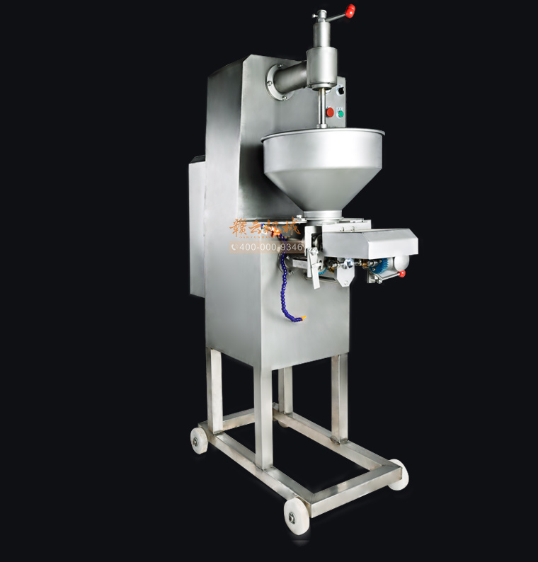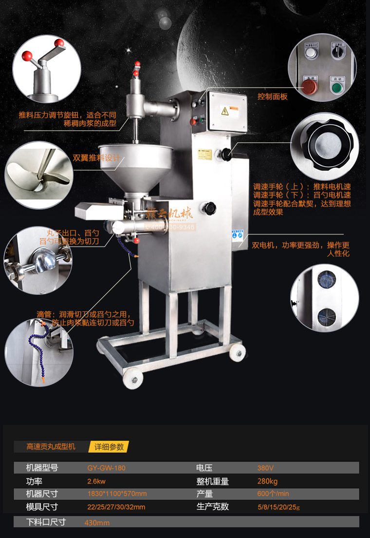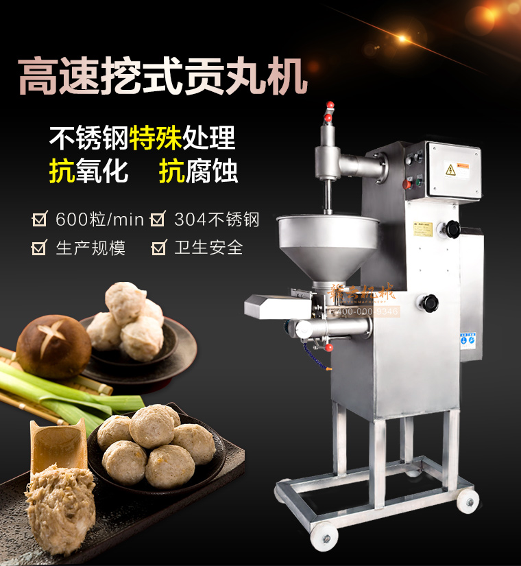 你是想成型哪种肉丸呢,猪肉丸、牛肉丸、鱼丸、贡丸,想做的丸子漂亮光滑吗,用本款赣云牌180高速贡丸成型机就可以完美做到。本款180型贡丸机适用于制作各种高低档鱼丸、牛肉丸、素丸、肉丸、牛筋丸、贡丸、墨鱼丸等实心产品,成型出的丸子具有圆度好、外表皮光滑或保持原浆体颗粒,还可以拔层的特点。180贡丸机主体材质为304不锈钢,机体采用6mm不锈钢板焊接,配电箱及后防护罩为1.2MM不锈钢,刀片材质为硬质不锈钢,模具材质采用铜、pom材质。齿轮内部传动采用45号热处理钢材,成型接触食品齿轮为304不锈钢和青铜、POM耐磨材料。操控系统为电磁启动过载过热保护,设有急停开关安全系统。电机品牌为永嘉南方减速机。传动结构为齿轮传动和牙盘链条传动。成型剪切采用关节杠端轴承拉杆原理动作均匀稳定。配备17/22/27/30/32mm这5个模具尺寸,采用半开明型钢刀快速抽剪成型方式成型丸子,可以将牛筋猪肉筋膜等不易剪断的产品成型及可用于鱼丸成型,操作简便,安全可靠。易于清洗,清洗时漏斗及模具等均可拆装清洗。以下是本台机子的整机展示: