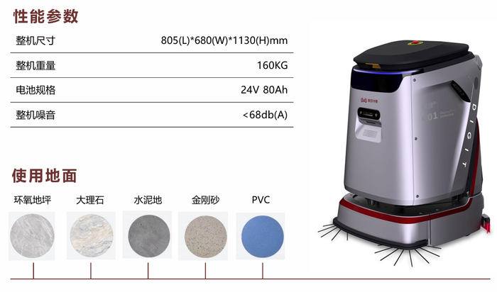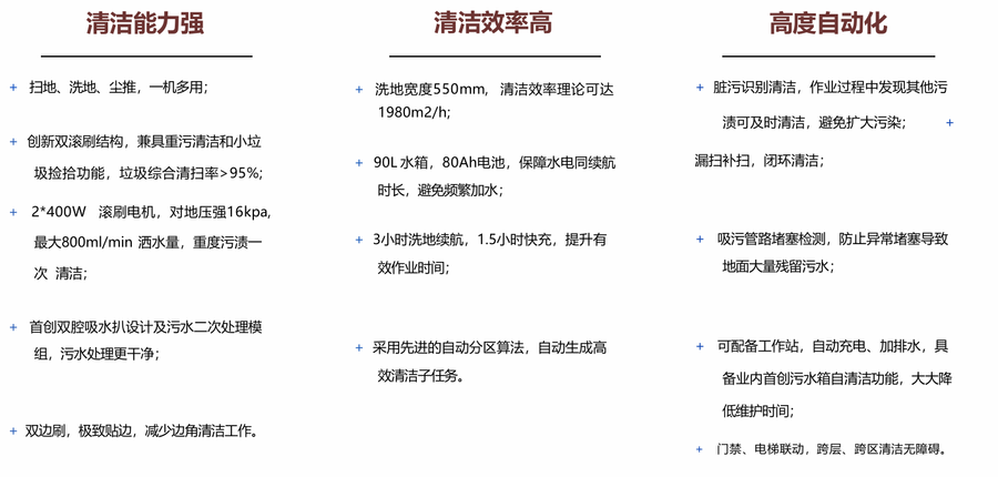 面向中大型场景的智能清洁设备,具备扫地、洗地、尘推等多种清洁功能,同时清洁能力,
