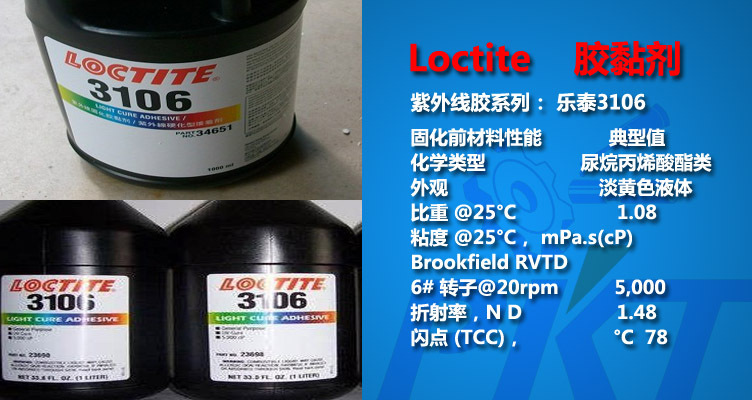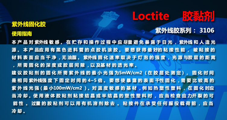 乐泰®产品3106 是一种单组分,触变形胶粘剂,当该产品暴露于紫外线和/或具有足够强r