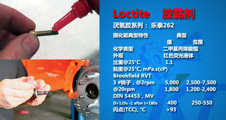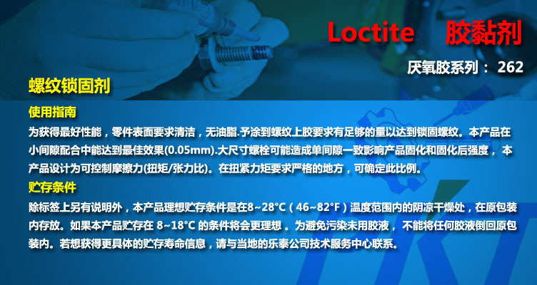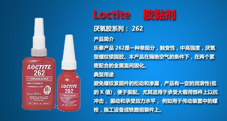 乐泰ò产品262 是一种单组分,触变性,中高强度,厌氧型螺纹锁固胶。本产品在隔绝空