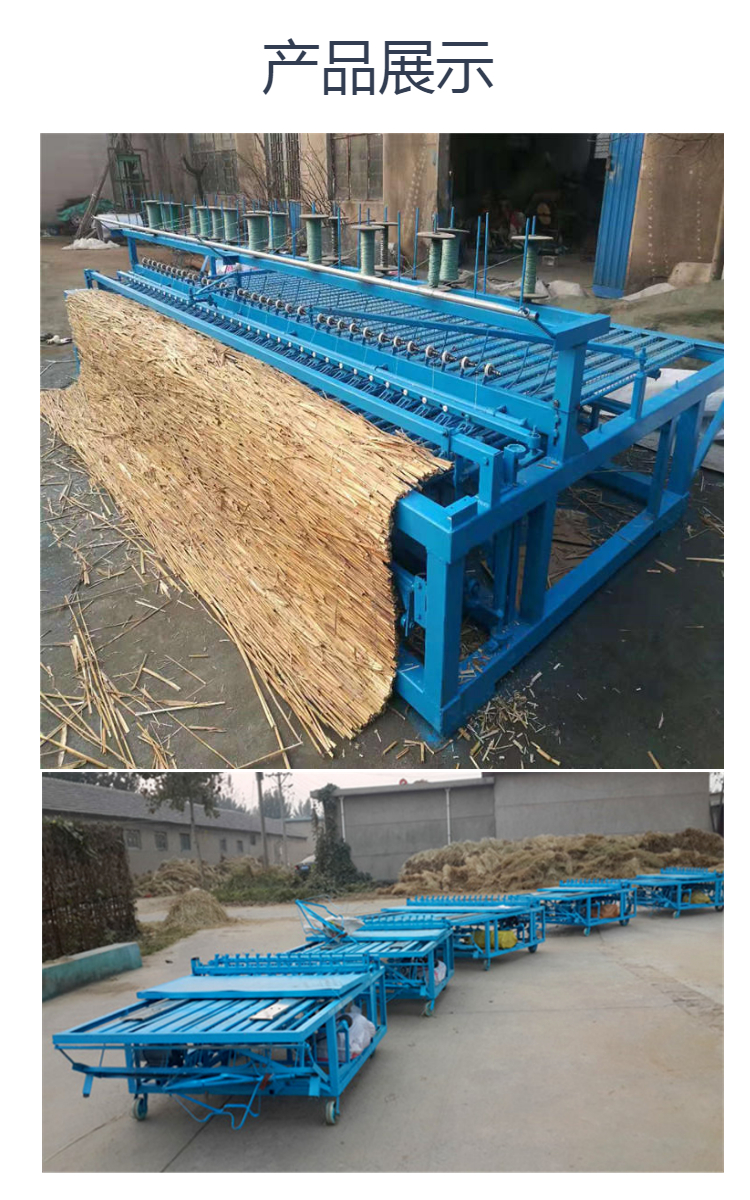 各种型号的草帘机、草苫机,蒲帘机,棕垫机,传动部位采用全杠杆结构,所生产的棕垫机,一机代替了50工,只要把棕垫的半成品放在机器的工作台上,开动开关每2分钟一床(2米),距离均匀,针距严密,省时省力。以稻草、麦杆、山草、蒲草等作为生产原料,生产厚度0.5CM的包装用小草帘,也能生产厚度5CM的大棚用保温草帘,广泛适应于大棚、砖厂、予制厂、草皮、路面、车皮包装等行业。是中小企业个人的致富机械。