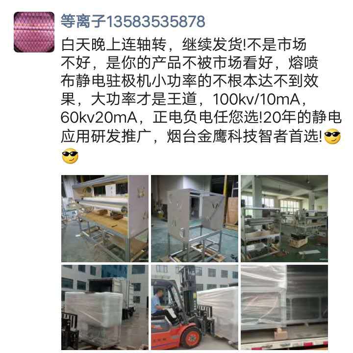 公司有十九年的制造销售静电驻极设备经验,不仅确保静电发生器的稳定性问题,而且可以能满足熔喷布生产的不同布宽度需要,为客户提供定制化服务。本公司静电驻极机具有多种保护功能,能确保生产过程中的安全、可靠。欢迎电话咨询,微信同号,欢迎实地考察本公司是否具备生产高效率高精度静电驻极设备的能力。