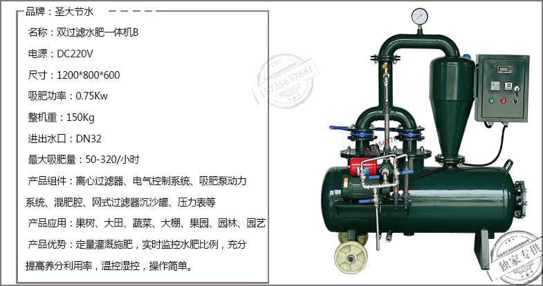 圣大节水生产的双过滤水肥一体机由离心过滤系统、电器控制系统、吸肥动力系统、网式过滤系统、混肥腔、肥料原液罐、压力检测系统组成。