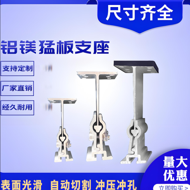 彩钢瓦铝合金支座是用于固定彩钢瓦或金属屋面板(如铝镁锰板)的关键配件,通过与屋面龙骨或檩条连接,支撑并固定屋面板,同时适应热胀冷缩变形。其核心功能包括: