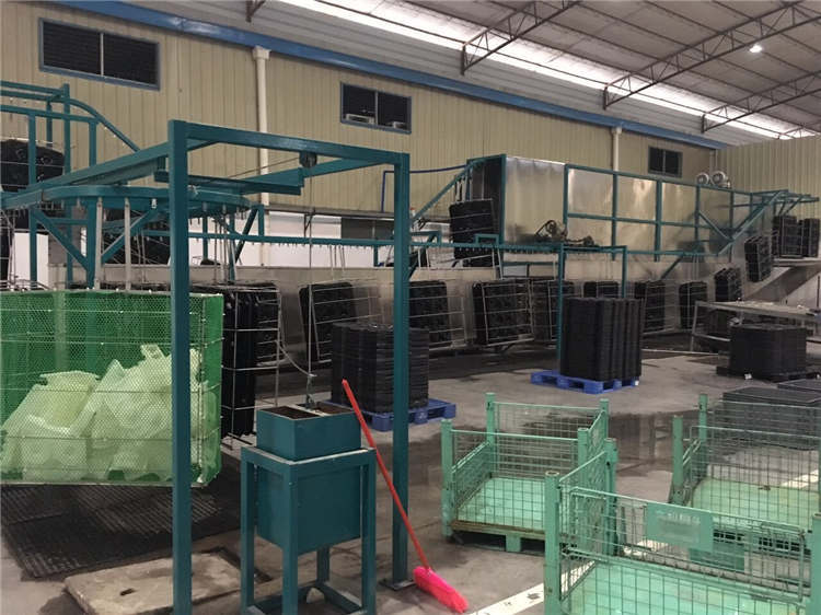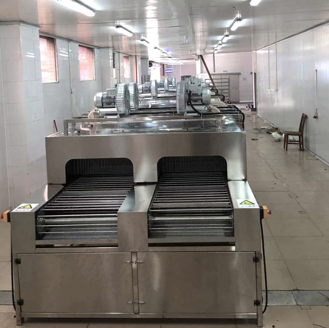 需清洗的周转筐由不锈钢链条输入清洗机中,依次通过热水除油→高压热水清洗消毒→常温自来水漂洗→高压风刀去水等多道工序,将筐子清洗干净,同时完成杀菌及风干;特殊筐子清洗时可在热碱水清洗段后加配毛刷,对筐子底部及左右两侧进行刷洗,提高清洗效果;采用连续式清洗,以提高清洗效率;