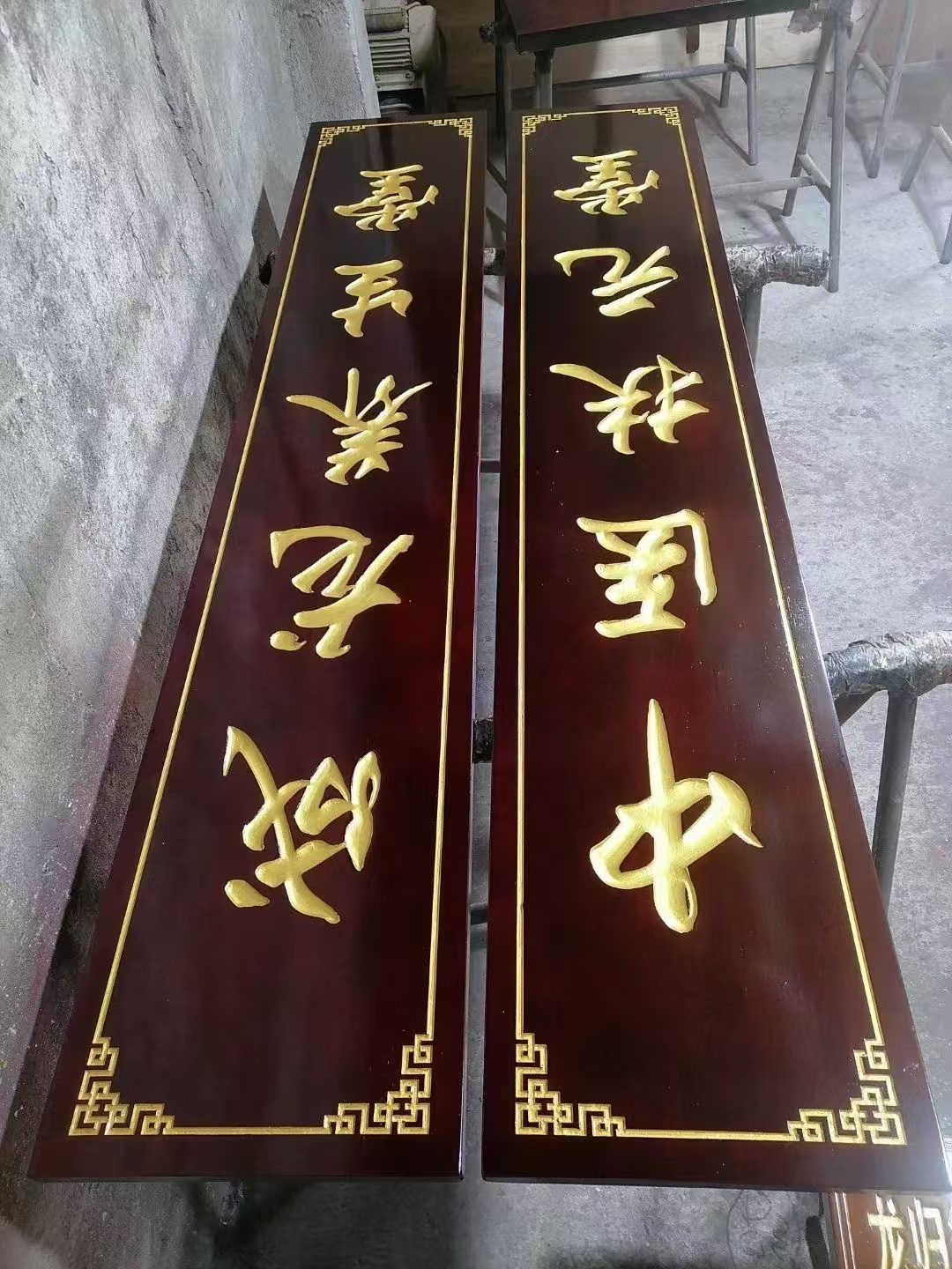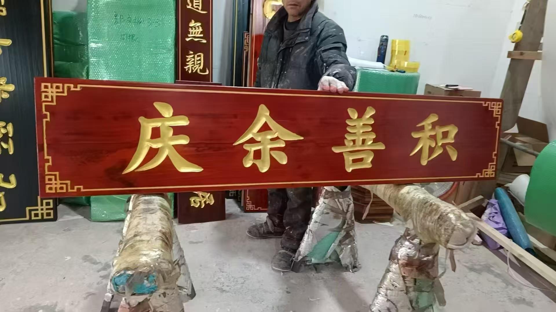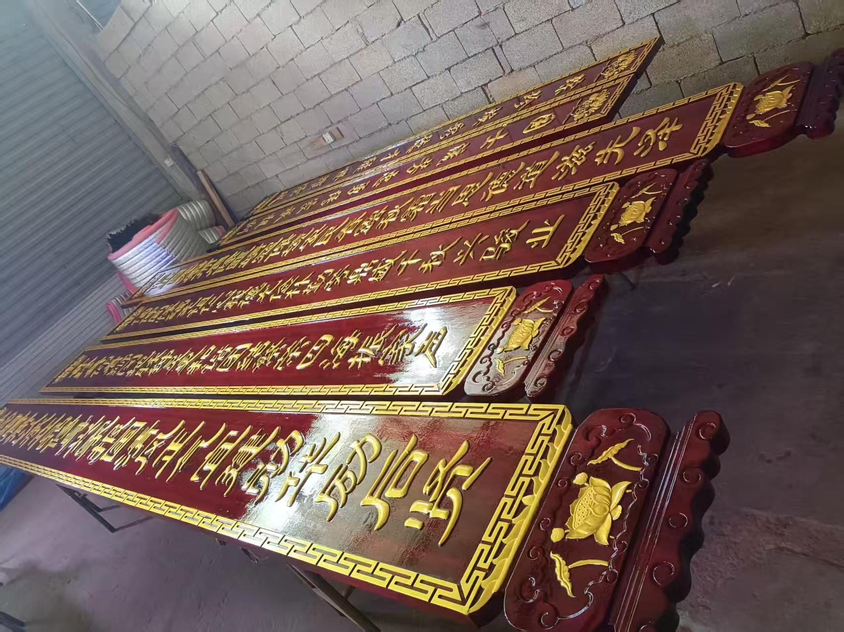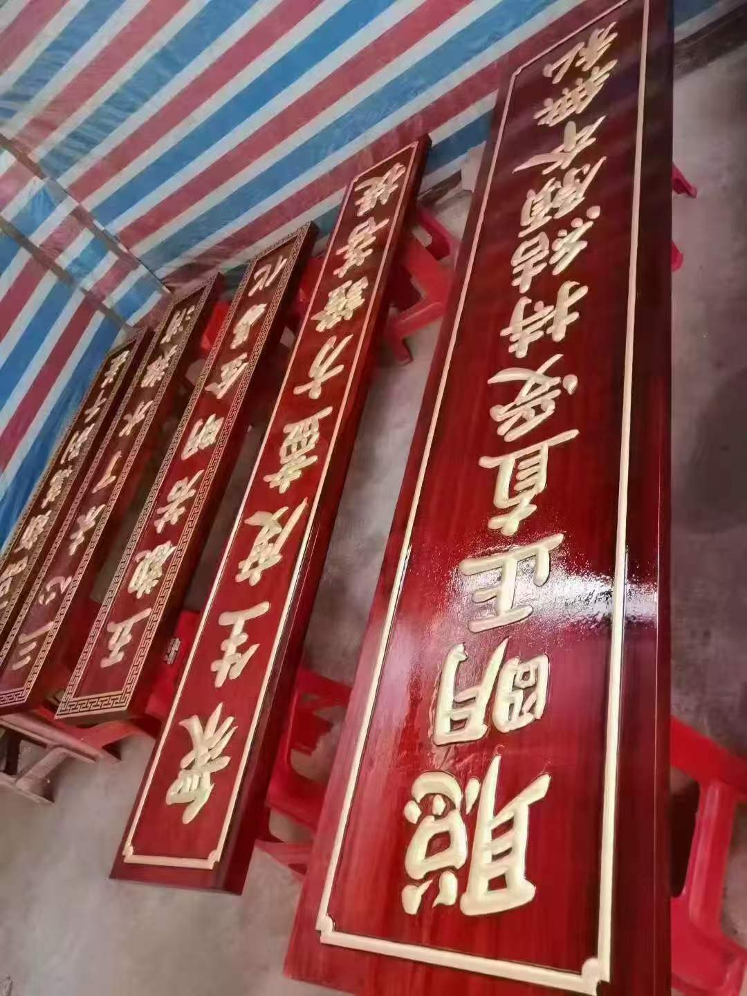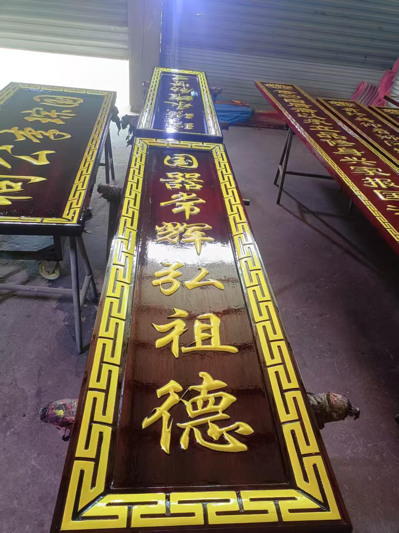 我们选用整块老料实木,材质坚硬耐用,纹理自然大气,不掺假、不拼接,做工扎实。从雕刻、描金、上漆到成品,全是老师傅手工制作,字体苍劲有力,楹联对仗工整,端庄大气,一挂上去,祠堂立马庄严气派,尽显宗族底蕴。