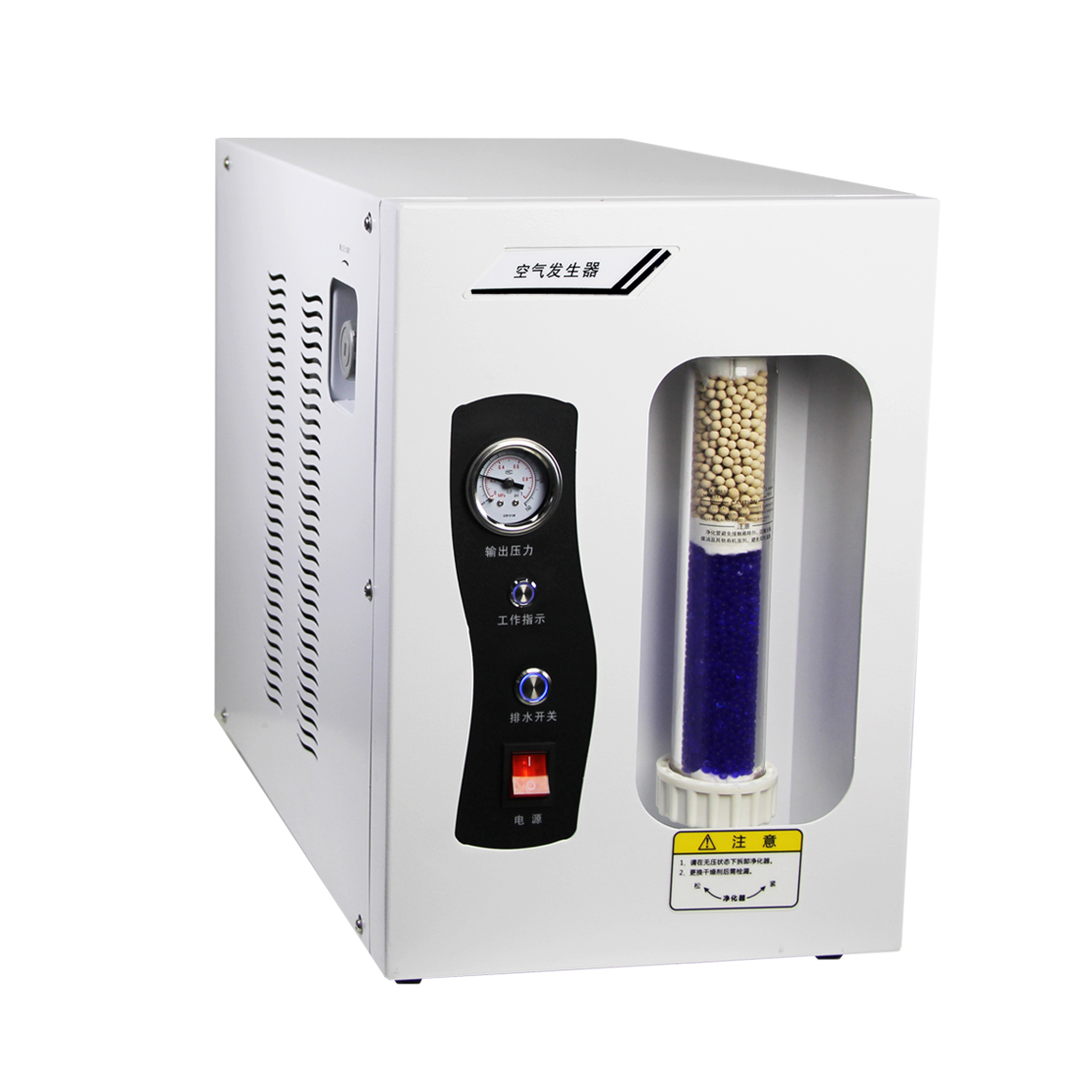 冷干式空气发生器作为气相色谱仪的空气源可以替代实验室中的高压钢瓶,使您的分析工作更加方便,安全。本仪器具有二次过压保护装置和过温自控装置,当气体压力超过设定值或压缩机机壳温升达到80℃时,自控系统会自动关闭电源,保证系统安全可靠,另外仪器带有常压启动装置,延长了压缩机寿命;本仪器的气体净化系统使用5A分子筛和活性碳,保证输出气体的纯净度;气路系统采用双级稳压提高了气源的稳定性。