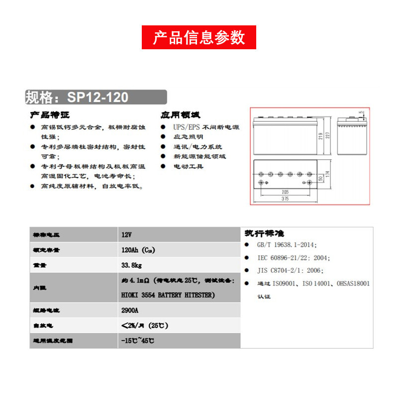 圣阳SP12-120铅酸蓄电池 12V120Ah 阻燃免维护 全国联保
