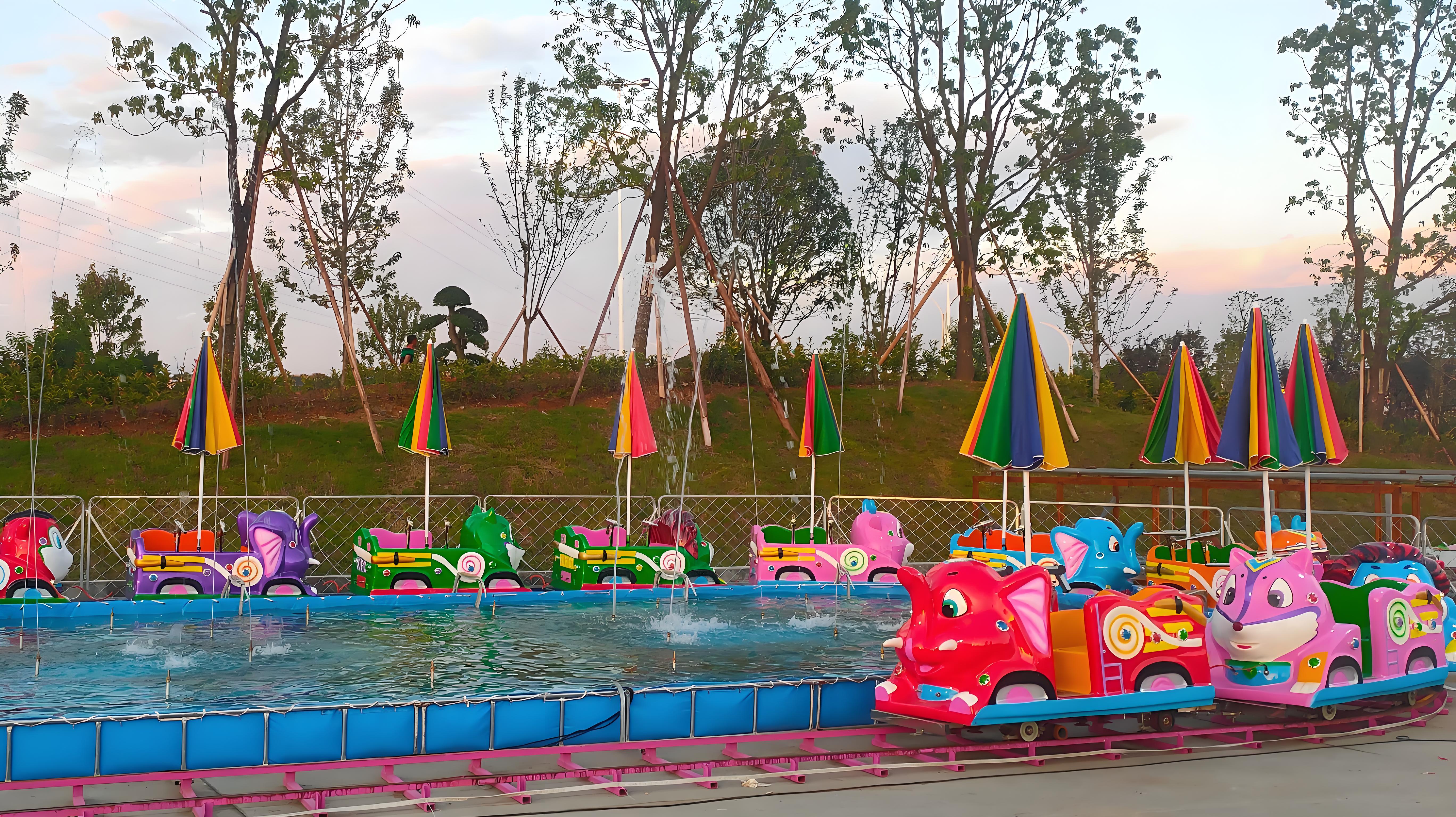水陆战车座舱配备高压水枪或,游客可射击中央假山上的装饰动物(如、、长颈鹿等)。动物被击中后会发出逼真叫声或喷水,配合灯光与音效(如战车轰鸣、发射声),营造沉浸式战场体验。