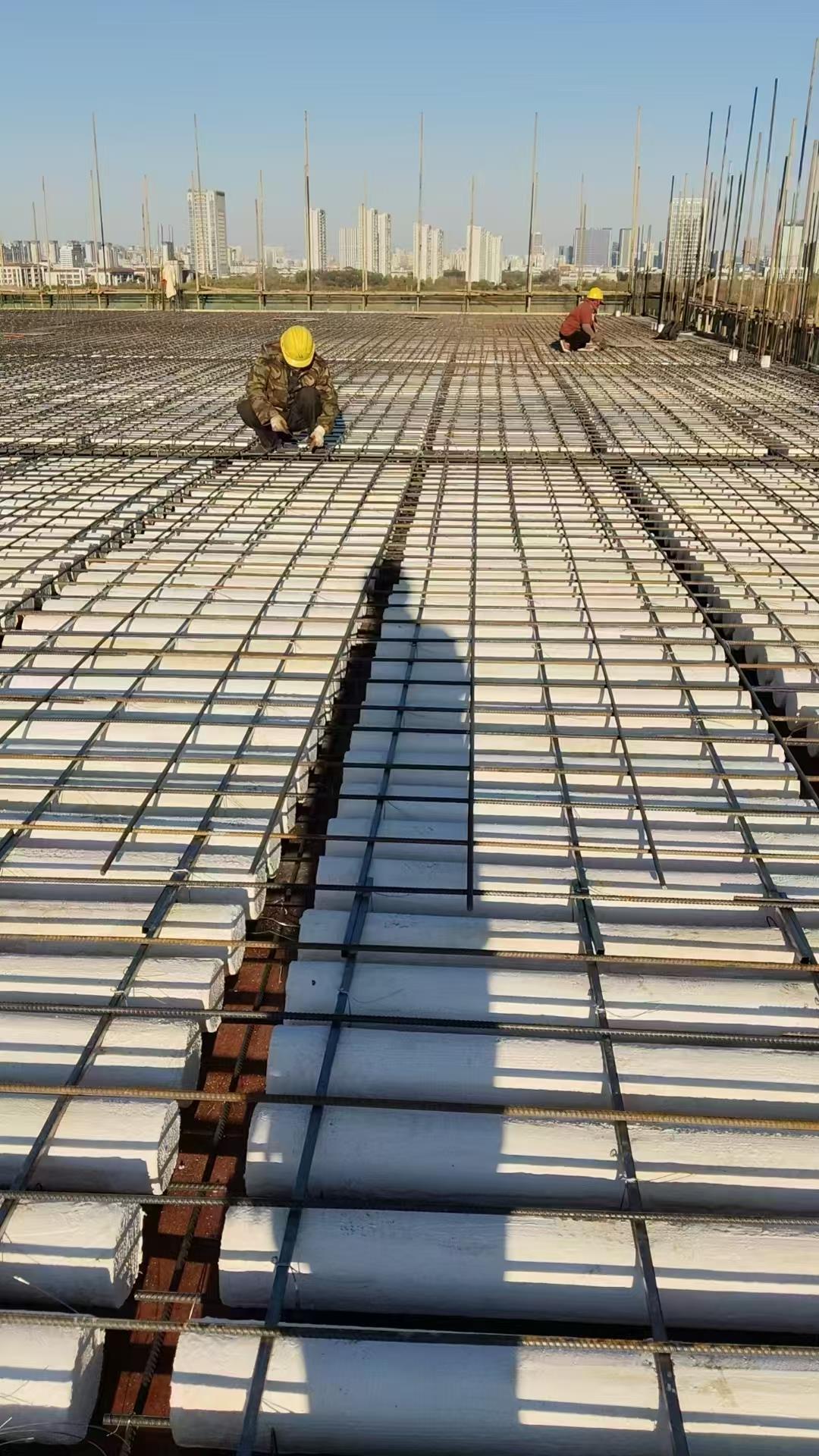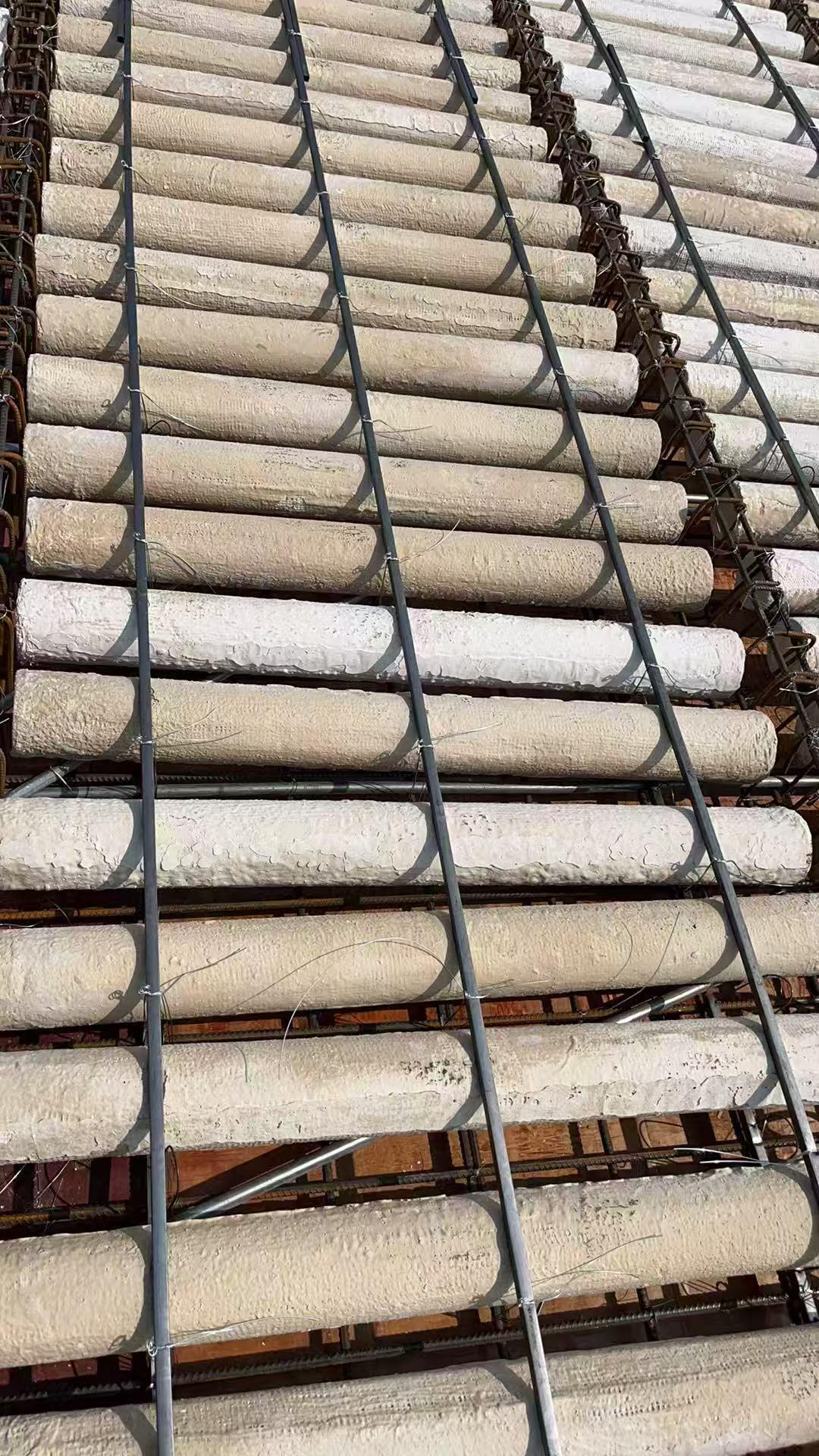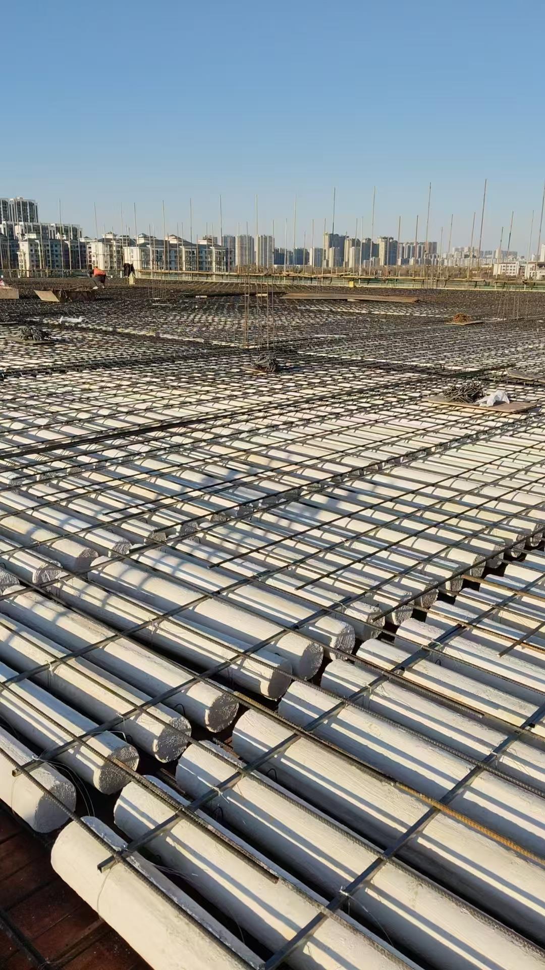 GBF 空心薄壁管作为现浇混凝土空心楼盖的核心内模构件,采用高强复合纤维与水泥基材料精制而成,产品强度高达 100MPa,壁厚可控(3-50mm),空心率稳定超 40%。规格覆盖直径 250mm(壁厚 25mm,单米重 13kg)至 1200mm,可满足 40m 跨度建筑需求。管体质轻高强,埋入混凝土后形成双向受力密肋结构,在等效刚度下比实心楼板减重约 40%,大幅减少混凝土与钢筋用量,同步降低梁柱等竖向构件截面与造价,是大跨度、大荷载建筑的理想选择。