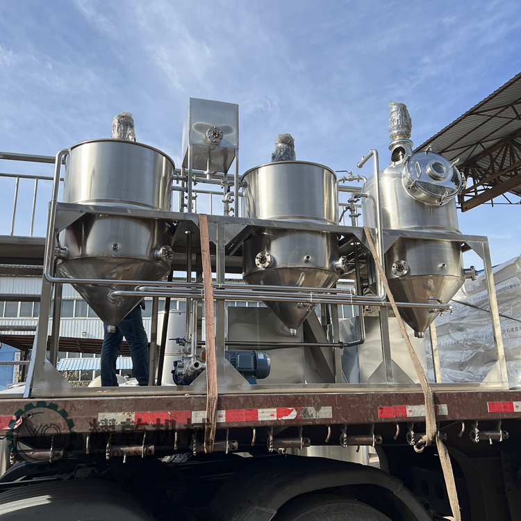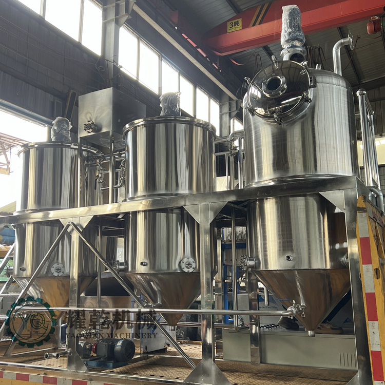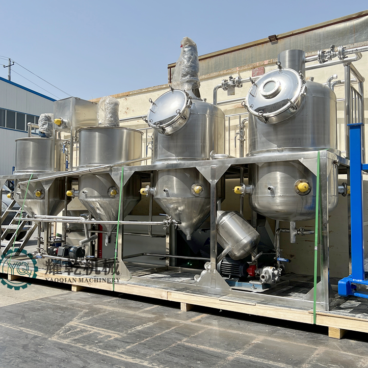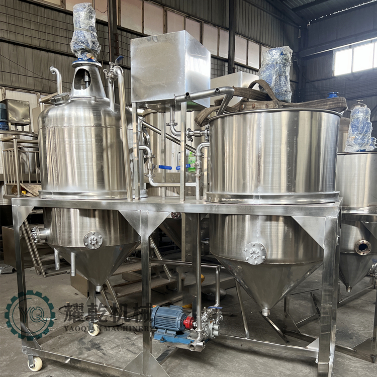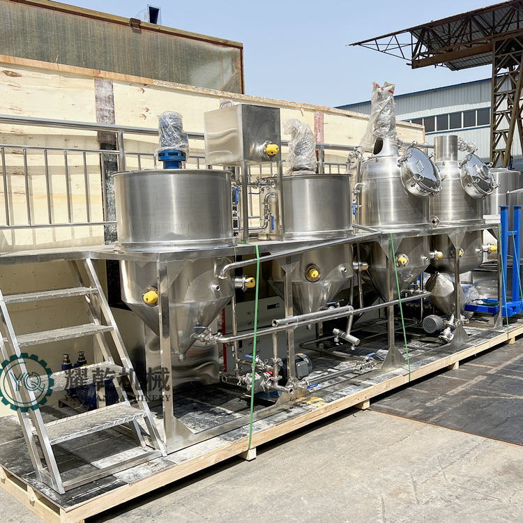 油坊精炼机 小型菜籽油精炼设备 花生大豆油压榨深加工生产线通常由精炼罐、脱色罐、过滤器及油泵和电机电控系统组成,可实现毛油脱胶、脱酸、干燥和脱色等功能。经过脱酸、脱胶、脱色、脱臭等工艺后,能使压榨油的过氧化值、气味等指标达到国一标准,即食用油质量标准。经精炼机处理后的油脂,色泽透明,长期放置无沉淀,下锅不起沫,无油烟,可直接灌装销售,适用于来料加工和小规模油脂加工厂使用。