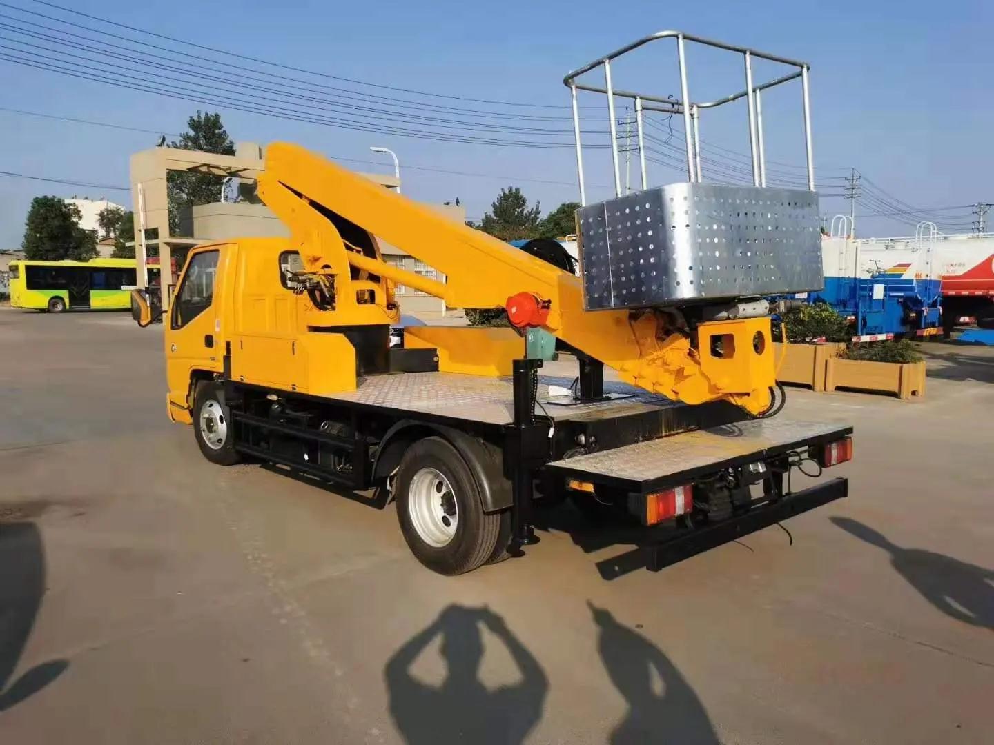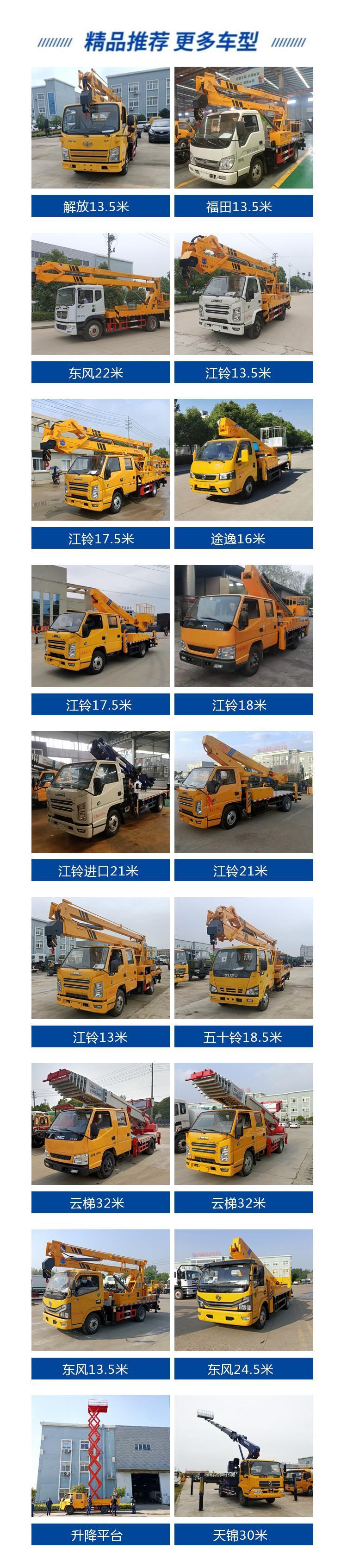 公司生产折叠臂高空作业车、伸缩臂高空作业车、垂直升降平台、搬家作业车等各类型高空作业车。高空作业车由液压或电动系统支配多支液压油缸,能够上下举升进行作业的一种车辆。采用液压传动的载人高空作业车,是当代先进的物种机械设备。广泛用于电力、路灯、市政、园林、通信、机场、造(修)船、交通、广告、摄影等高空作业领域。