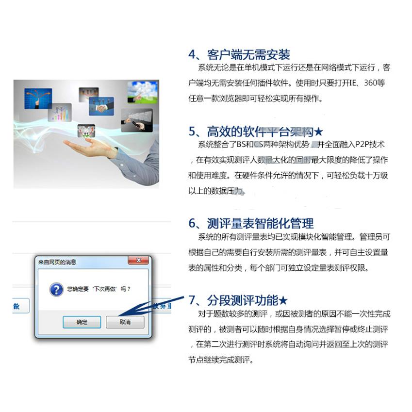 系统整合了BS和CS两种架构优势,既可以单机进行测试训练又可多人同时进行团体测试和训练,系统融入P2P技术,在实现使用人数化的同时限度的降低了操作和使用难度,单人和多人模式只一键就可以实现快速切换,非常灵活高效。