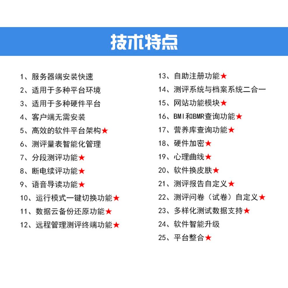 本系统采用国际标准的BMI和BMR指数,以亚洲常模为依据,将被测者的性别、年龄、身高、体重以及劳动强度等进行综合同步换算,在给出被测者身体质量指数(BMI)的同时系统还将自动给出被测者的基础代谢率(BMR)。并根据基础代谢率(BMR)给出具体的饮食热量方案以及各餐的营养分配方案(如:早、中、晚餐的热量摄取值、食谱等)。