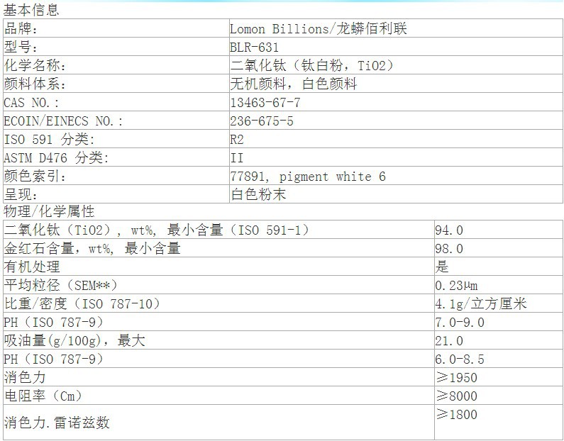 佰利联 BLR-631 是一种油墨专用钛白粉。该产品利用特殊的无机和有机表面处理技术,成熟的粒径控制技术,使其具有杰出的分散性、优异的光泽度、较好的遮盖力、高着色力和低损性。