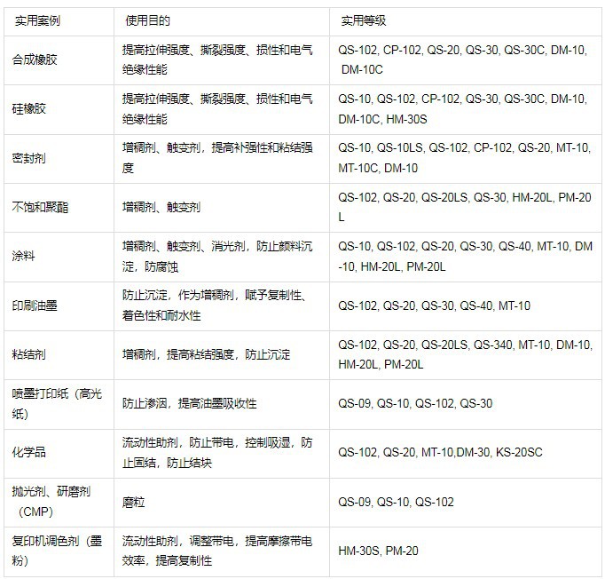 QS 102的应用领域:主要用于硅橡胶(HTV、RTV),树脂涂料,油漆,油墨,电子,造纸,医药,化妆品,牙膏,胶粘剂,塑料等行业生产中,它的特性是具有很好的防沉淀,防垂流,增稠触变,抗沉降、提高介电性能,促进自由流动,自清等,是一种效果优良的自由流动助剂,正负体系外加控制剂,括性组分(催化剂等)载体,造粒助剂,加工助剂,防结块剂,稳定剂。