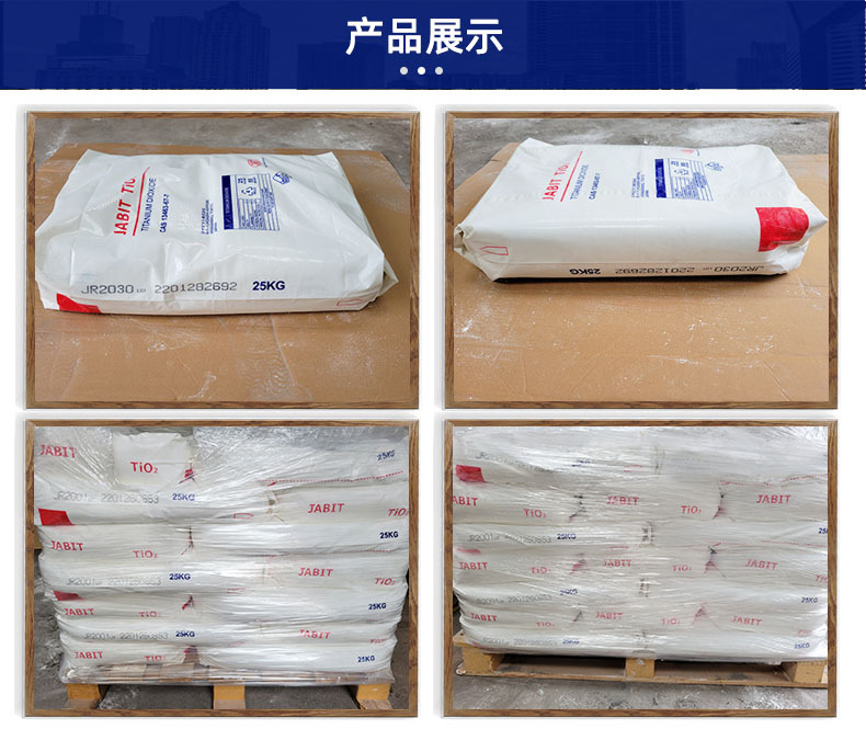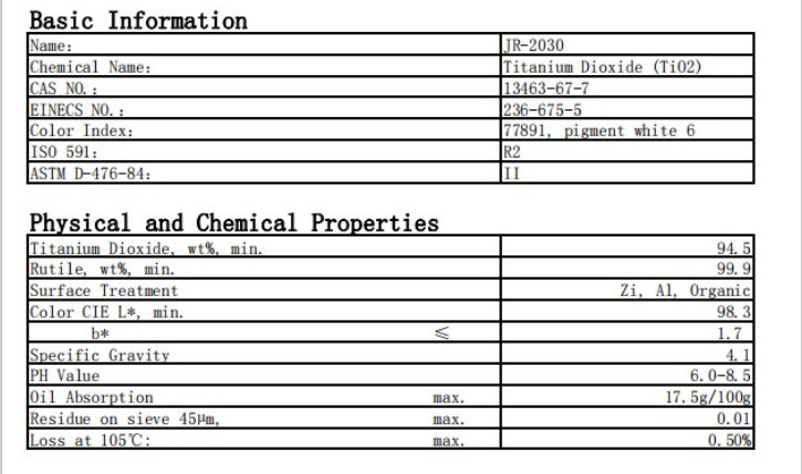 日本制造的JR-2030二氧化钛产品描述JABIT®JR-2030是一种经过氯化处理的金红石型二氧化钛颜料。经过特殊的无机和有机表面处理,具有明亮的白度和蓝色底色,耐候性好,遮盖力高,分散性能好。