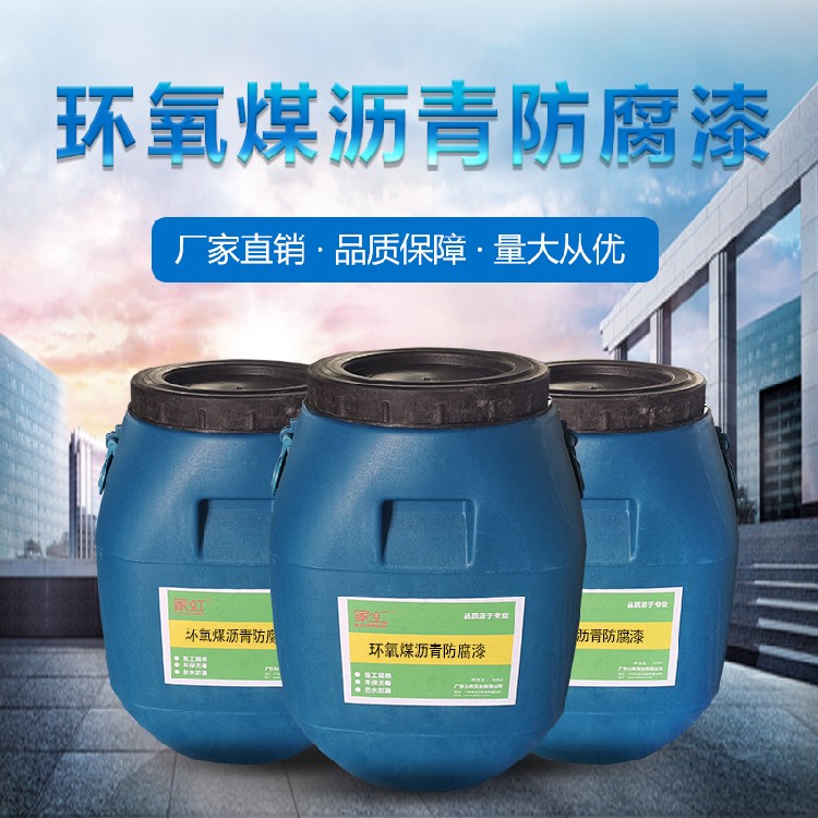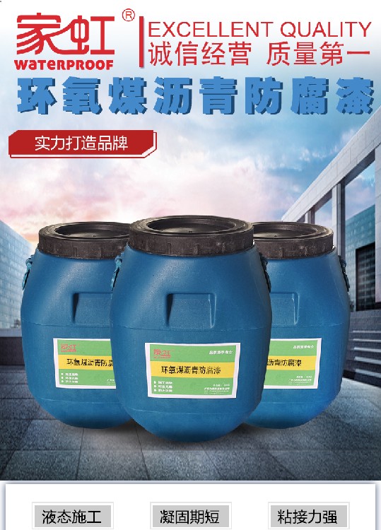 家虹环氧煤沥青漆家虹环氧煤沥青面漆和底漆为配套产品,它兼有煤焦沥青耐水防腐性能及环氧树脂漆附着力好,漆膜坚韧,机械强度高,防化学腐蚀好的优点,底漆中加入有效的防腐颜料。面漆中加入大量的片状颜料。固化后漆膜形成致密坚实不透水涂层。底面漆配套涂层能发挥极好的防腐性能。家虹环氧煤沥青漆为双组分包装,成分一为基漆,成分二为固化剂,现用现配,常温自然干燥。【用途】家虹环氧煤沥青漆广泛用于水下钢结构和水泥构件的防腐防渗漏,地下管道及贮气柜下不水槽的防护,高温地区沿海及盐场的各种机械设备,化工及其他管道的内外壁防腐,他还适用于常年潮湿环境或施工环境潮湿的底材表面及涂膜要求韧性较高的部件。【施工参考】1、两组份按比例混合后充分搅拌,施工务必在5度以上。2、可以喷涂、刷涂、滚涂,如果粘度过大可适用专用稀释剂调整至涂装不流淌为宜3、使用期为6h,时间过长易胶化,混配后可在低温下存放,可适当延长胶化时间。4、涂层结构分为轻防腐二道底漆三道面漆强防腐二道底漆四道面漆特强防腐二道底漆五道面漆每道底漆湿膜60um干膜30um面漆湿膜60um干膜30um