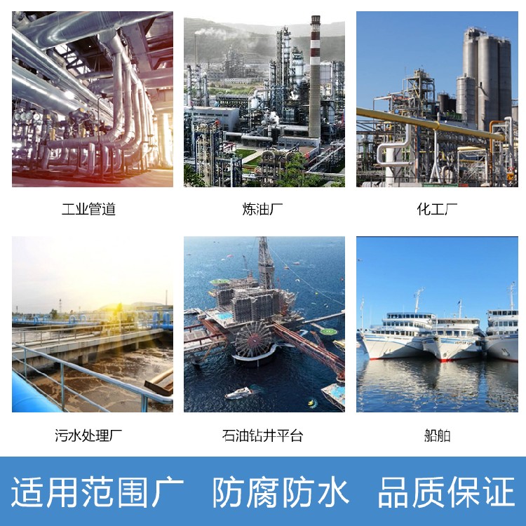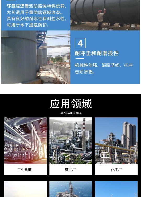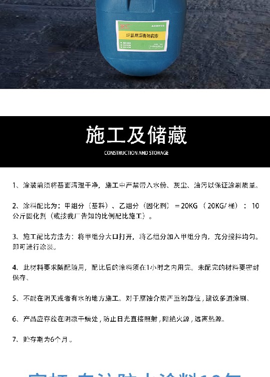 环氧煤沥青防腐漆一、组成: 该产品是由环氧树脂、煤焦油沥青、防锈颜料、助剂、改性胺配制而成。产品具有干燥迅速,附着力好、柔韧性好,双组分包装、施工方便。具有耐酸、耐碱、耐盐、耐水、耐油等特点。二、特性及用途: 该漆综合了环氧树脂的机械强度高、粘接力大、耐化学介质浸蚀和沥青的耐水、抗微生物、抗植物根系的特点,是一种高性能的防腐绝缘涂料,该产品有良好的耐化学药品性、耐水性。 适用于输油、输气、输水管道,自来水、煤气、管道、炼油厂、化工厂、污水处理厂的设备和管道的防腐,亦可作为海洋石油钻井平台及船舶水下部的防腐及矿山、井下设施的防腐。可配合玻璃丝布使用。混泥土和钢材材质均可使用。三、施工及贮存:(1):涂装前须将基面清理干净,施工中严禁带入水份、灰尘、油污以保证涂刷质量。(2):涂料配比为:甲组分(基料)、乙组分(固化剂) = 20kg ( 20kg/ 桶) : 10公斤固化剂(或按我厂告知的比例配比施工)。(3):施工配比方法为:将甲组分大口打开,将乙组分加入甲组分内,充分搅拌均匀。即可进行涂装。(4):此材料要求随配随用,配比后的涂料须在1小时之内用完。未配完的材料要密封保存。(5):不能在阴天或者有水的地方施工。对于腐蚀介质严重的部位 , 建议多道涂刷。(6):产品应存放在阴凉干燥处 , 防止日光直接照射 , 隔绝火源 , 远离热源。(7):贮存期为6个月 。