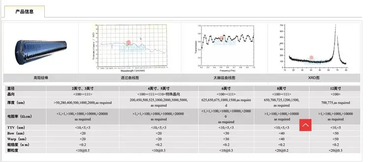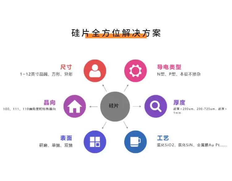 尺寸:1”,2”, 3”,4”,5”,6”,8”,12”和特殊非标直径及异形硅片;