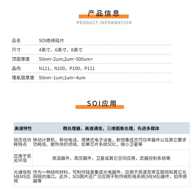 SOI wafer尺寸:4”, 5”, 6”,8";