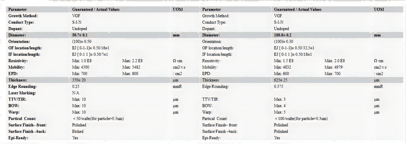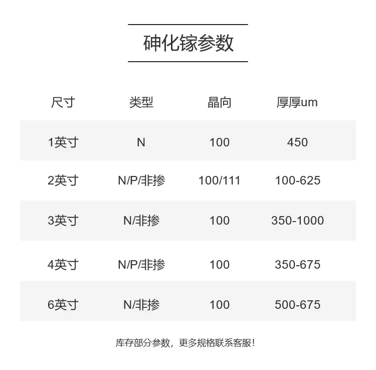 类型:N- type 掺Si, P- type 掺Zn,半绝缘Undope;